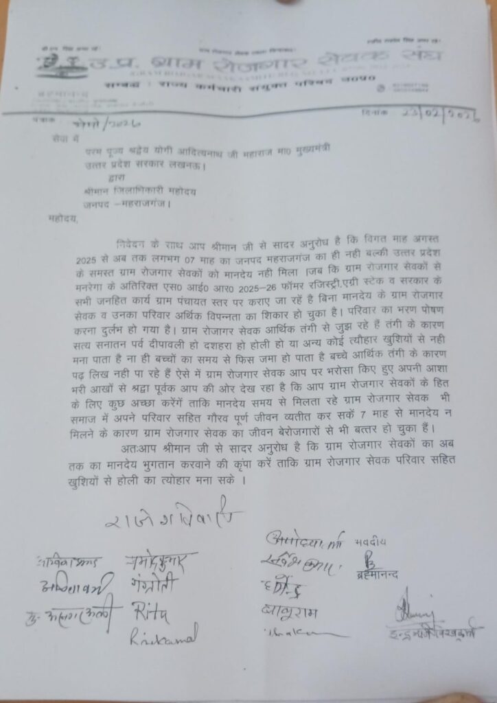 महराजगंज/उत्तर प्रदेश (राष्ट्र की परम्परा)। जनपद के ग्राम रोजगार सेवकों में पिछले 7 माह से मानदेय न मिलने को लेकर भारी नाराजगी व्याप्त है। उत्तर प्रदेश ग्राम रोजगार सेवक संघ की जिला इकाई महराजगंज के जिलाध्यक्ष/प्रांतीय उपाध्यक्ष ब्रह्मानंद ने जिलाधिकारी के माध्यम से योगी आदित्यनाथ को ज्ञापन भेजकर लंबित मानदेय के तत्काल भुगतान की मांग की है।