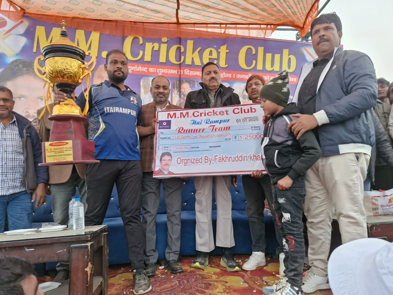 सादुल्ला नगर/बलरामपुर (राष्ट्र की परम्परा)।पूर्व प्रधान फखरूददीन खान के संयोजन में आयोजित एमएम क्रिकेट ट्राफी के निर्णायक मुकाबले में सीएस के सी सी महुआ ने मैच जीतकर ट्राफी अपने नाम कर लिया। विजेता व उपविजेता टीम को मुख्य अतिथि पूर्व विधायक धीरेंद्र प्रताप सिंह धीरू सिंह ने क्रमशः ढाई लाख व सवा लाख नगद व ट्राफी देकर सम्मानित किया। इटईरामपुर के करबला मैदान में फखरूददीन खान के संयोजन में आयोजित एम एम क्रिकेट ट्राफी के निर्णायक मुकाबले में सीएसके सीसी महुआ व बेवफा टी स्टाल सी सी इटईरामपुर के बीच खेला गया। टास जीत कर बेवफा टी स्टाल सीसी ने बल्लेबाजी का निर्णय लिया।निर्धारित 14 ओवर में बेवफ़ा टी स्टाल सी सी ने 105 रन स्कोर किया सर्वाधिक 46 रन शकील बरेली ने बनाया ।जवाबी पारी में सीएसके सी सी महुआ ने तेरहवें ओवर में 6 पर लक्ष्य प्राप्त कर लिया सर्वाधिक रन विकास तिवारी कैरी ने 48 रन का योगदान दिया विजेता टीम के अंकित सिंह कलकी मेन आफ द मैच रहे। उपविजेता टीम के मोहसिन बेस्ट बैट्समैन व जावेद मैन ऑफ द टूर्नामेंट रहे।मुख्य अतिथि धीरेंन्द्र प्रताप सिंह धीरू सिंह ने कहा कि खेल में जीतना हारना नहीं वरन प्रतिभाग करना महत्वपूर्ण होता है खेल से समाज में भाईचारे की भावना को बल मिलता है खेल खिलाड़ियों व दर्शकों को संयमी व धैर्यवान बनाता है।आयोजक फखरूददीन खान ने उपस्थित लोगों का आभार व्यक्त करते हुए बताया कि आगामी अप्रैल माह में आयोजित क्रिकेट कप के विजेता टीम को दस लाख रुपये व उपविजेता टीम को पांच लाख रूपये दिये जायेंगे ।उक्त प्रतियोगिता के आयोजन में वसीम मलिक, अदनान खान, दिलीप जायसवाल का विशेष योगदान रहा। समापन अवसर पर तौकीर अहमद, जमीर मलिक, डाक्टर मजहर,शहजाद,मलिक मुहम्मद,बदरूददीन,कमालुददीन, गुज्जी लाल चौहान प्रधान गजपुर ग्रिंट,डाक्टर मुहम्मद अहमद,सोनू गुप्ता,राजेश प्रधान, जावेद खान, डाक्टर एहसान, डाक्टर रहीम,आसिफ, कौसर, नबीउल्लाह व मदन जायसवाल मौजूद रहे।।