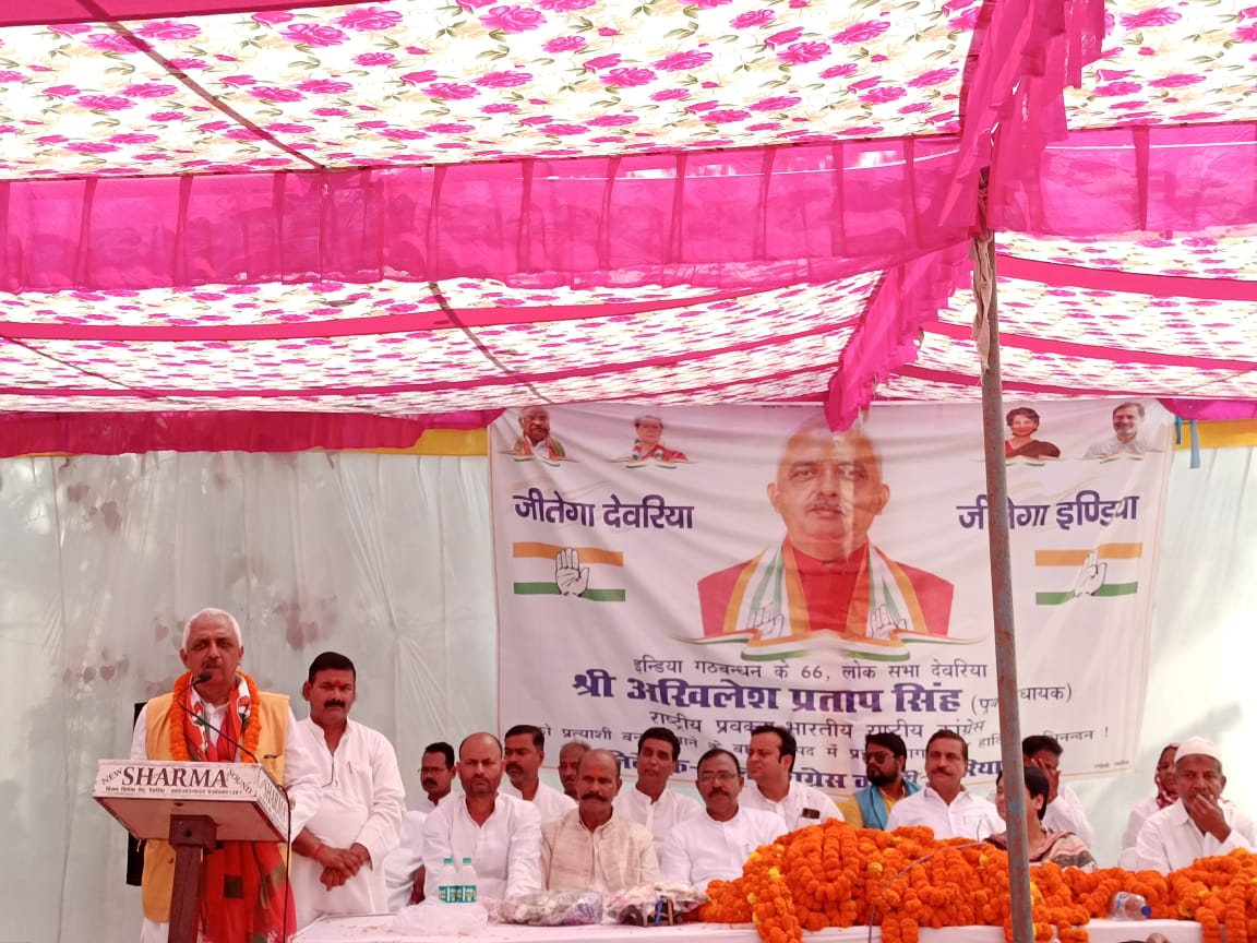 इस दौरान सम्बोधित करते हुए अखिलेश प्रताप सिंह ने कहा कि भाजपा के झूठ से देश की आम जनता परेशान हो गई है। देवरिया संसदीय क्षेत्र के लोगों को केवल कोरा आश्वासन दिया गया। इस क्षेत्र की चीनी मिलों का चलाने का वादा भी पूरा नहीं हो सका। रिंग रोड बनने का काम अब तक शुरू नही हो सका।क्षेत्र की अधिकांश सड़के जर्जर हो गई हैं।सरकारी अस्पताल केवल रेफरल अस्पताल बन कर रह गए हैं इनमें बुनियादी सुविधाओं का अभाव है।अगर आप सभी का आशीर्वाद प्राप्त हुआ तो देवरिया जिले व संसदीय क्षेत्र में विकास का नया कीर्तिमान स्थापित करूंगा। जिलाध्यक्ष रामजी गिरि ने कहा कि विकास पुरुष अखिलेश प्रताप सिंह ने क्षेत्र में विधायक रहते हुए बेहतर सड़को व पुल का जाल बिछाकर साबित कर दिया कि इस बार इसी मिट्टी का बेटा आपका आशीर्वाद प्राप्त करेगा। गोरखपुर से देवरिया होते हुए सलेमपुर का फोरलेन सड़क इनके प्रयास से ही स्वीकृति हुआ जो अब बनकर तैयार हो गया है।भाजपा ने केवल देश के बेरोजगार ,नौजवान किसान,छोटे व मध्यम व्यापारियों को धोखा देने का काम किया है। कार्यक्रम को पुर्व जिलाध्यक्ष सुयश मणि त्रिपाठी, बिस्मिल्लाह मुन्ना लारी,राघवेंद्र सिंह राकेश,धर्मेन्द्र सिंह, शहला अहरारी,पुरुषोत्तम नारायण सिंह, आनंद श्रीवास्तव,दीनानाथ भारती, आनन्द देव गिरि चुन्नु,जयदीप त्रिपाठी,वरुण राय, शाकिर हुसैन,जुलेखा खातून,डॉ धर्मेन्द पांडेय, दीनदयाल यादव, आलोक त्रिपाठी राजन,नीलेश त्रिपाठी, सुनील द्विवेदी,नौशाद रजा,नागेन्द्र शुक्ल, गोविंद मिश्र, बदरे आलम,आसमा खातून, उपेन्द्र कुमार, अशोक गौंड, नौशाद खान एपी,भरत मणि त्रिपाठी,मानवेंद्र तिवारी, जेपी यादव,सत्यम पांडेय,धनंजय पांडेय,सुहैल अंसारी,कैलाश तिवारी, बृजेश सिंह, प्रेमलाल भारती, अवधेश यादव, दीपू सिंह,धर्मबीर भारती,विवेक मिश्र, ऋषभ शुक्ल, अंकुर भारती,हरिश्चंद्र सिंह, सोहन मिश्र ,पन्नालाल पाठक आदि प्रमुख रूप से उपस्थित रहे।