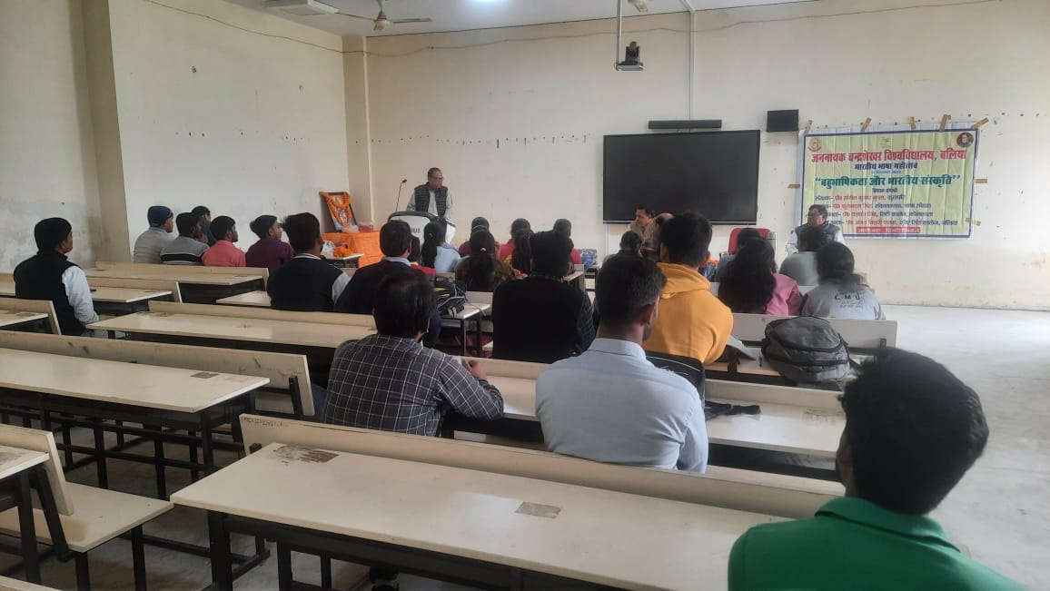 जननायक चंद्रशेखर विश्वविद्यालय में कुलपति प्रो. संजीत कुमार गुप्ता के संरक्षण में भाषा महोत्सव का आयोजन किया गया । भारतीय भाषा महोत्सव का आयोजन सुब्रह्मण्य भारती के जन्म पर मनाया जाता है। सुब्रह्मण्य भारती एक तमिल कवि थे। उनको ‘महाकवि भारतियार’ के नाम से भी जाना जाता है। उनकी कविताओं में राष्ट्रभक्ति कूट-कूट कर भरी हुई है। वह एक कवि होने के साथ-साथ भारतीय स्वतंत्रता संग्राम में शामिल सेनानी, समाज सुधारक, पत्रकार तथा उत्तर भारत व दक्षिण भारत के मध्य एकता-सेतु के समान थे। । इस संगोष्ठी का विषय ‘बहुभाषिकता और भारतीय संस्कृति’ था । कार्यक्रम में मुख्य वक्ता प्रो. यसवंत सिंह ने कहा कि भाषा ,भाषा के पार जाना सिखाती है । भाषा हमारी संस्कृति का धागा है जितनी बोलिया है उस माला के फूल है । भाषा के पार एक व्यक्तित्व होता है ।भाषा हमारी सांस्कृतिक पहचान होती है ।संस्कृति व्यक्ति को जोडती है ।कबीर जिस भाषा में बात करते थे वह सधुक्कड़ी है । उन्होंने यह भी कहा की कबीर की भाषा सांस्कृतिक भाषा है ।सभी सभ्यताएं मिलकर एक संस्कृति बनाती है । विशिष्ट वक्ता प्रो.अजय बिहारी पाठक ने कहा कि दमनकारी उपनिवेश के बाद भी हमारे देश में अनेक भाषाएँ है ।भारतीय समाज बना ही ऐसा है जिसमें स्वाभाविक रूप से बहुभाषिकता आ गयी है । अध्यक्षीय वक्तव्य में प्रो.फूलबदन सिंह ने कहा कि हम भौतिकता की चकाचौध में न रहे ।आज न संवेदना है ना ही संवाद है ।भौतिकता दोनों को नष्ट कर रही है ।अपनी भाषा और संस्कृति पर हमे गर्व करना चाहिए । कार्यक्रम का धन्यवाद ज्ञापन हिंदी विभाग के प्रभारी डॉ.संदीप यादव ने किया ।कार्यक्रम का संचालन हिंदी विभाग के सहायक आचार्य डॉ.अभिषेक मिश्र ने किया । इस अवसर पर शैक्षणिक निदेशक डॉ.पुष्पा मिश्रा,डॉ.प्रवीण नाथ यादव,डॉ.प्रमोद शंकर पाण्डेय,डॉ.शैलेन्द्र सिंह,डॉ.हर्ष त्रिपाठी,एवं विद्यार्थीगण उपस्थित रहे ।
