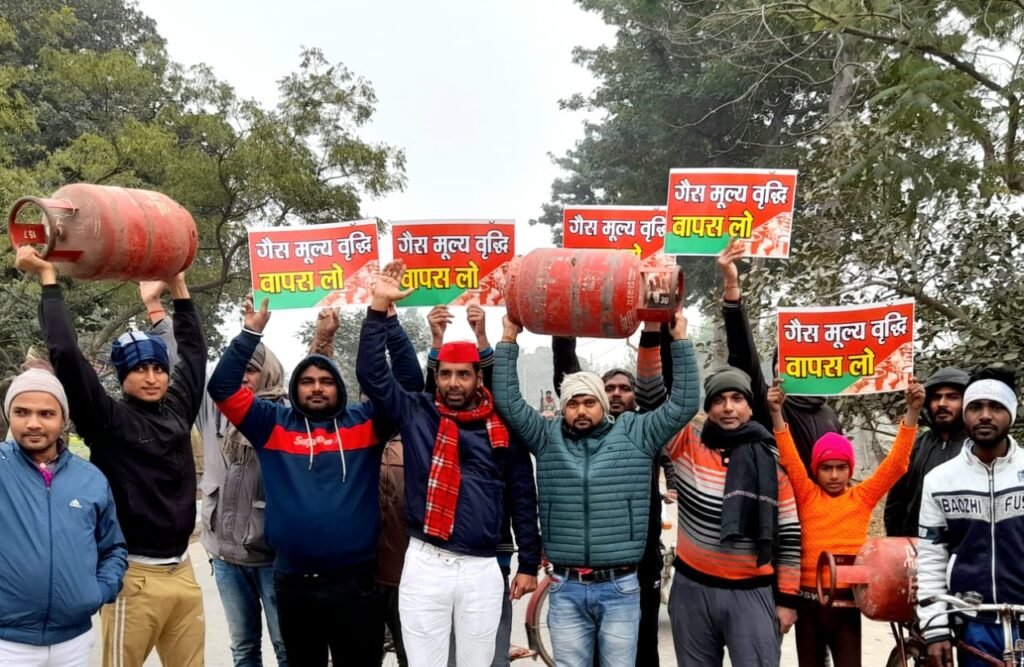 गुरुवार को सपा कार्य कार्यकर्ताओं ने कमर्शियल गैस सिलेंडर के दाम बढाएं जाने के विरोध मे, बरहज देवरिया बाई पास पर गैस सिलेंडर और हाथ में तकथी पर सलोगन लिख विरोध प्रदर्शन किया व सरकार विरोधी नारे लगाए। इस दौरान सपा नेता विजय रावत ने कहा कि जबसे भाजपा की सरकार बनी हैं महगाई चरम पर बढी हैं, और यह सरकार महगाई कम करने के बजाए देश की जनता को महगाई की आग में झोकती जा रही हैं। जिसका हिसाब आने वाले लोक सभा चुनाव में प्रदेश और देश की जनता लेगी, भाजपा ने जनता को गुमराह करके सरकार बनाई हैं। यही भाजपा ने चुनाव के दौरान अपने घोषणा पत्र में कहा था कि, हमारी सरकार बनेगी तो लोग को रोजगार मिलेगा, किसानों की आय दुगनी होगी, तथा महगाई कम करेंगे जिस पर प्रदेश की जनता ने विश्वास कर भाजपा को वोट दिया, लेकिन सरकार बनते ही भाजपा की सरकार ने रोजगार देने के बजाए नौकरी छीनने का काम कर रही और किसानों की आय दुगनी करने के बजाए कम कर दी तथा महगाई को आसमान पर चढ़ा दिया, जिससे आम आदमी का जिना मोहाल हैं। जनता अपना वोट भाजपा को देकर ठगा महसूस कर रही हैं। जनता अब ठान चुकी हैं कि आने वाले लोकसभा चुनाव में भाजपा सरकार के खिलाफ वोट देकर सबक सिखाना है। इस दौरान मुख्य रूप से अजित सिंह, विकास यादव, संजीव पाण्डेय, सुरेश शर्मा, विपिन सिंह, हसमत अली,महावीर गुप्ता, बादल प्रजाति, अजित कुमार, राजू श्रीवास्तव, कृष्ण मोहन यादव, परमात्मा यादव, अभिनव यादव, राजू यादव, सुरेंद्र कुमार, इत्यादि लोग उपस्थित थे।