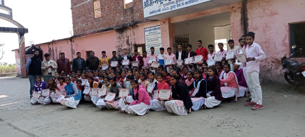 श्री अन्नपूर्णा इंटरमीडिएट कॉलेज गुरवलिया कुशीनगर में विज्ञान एवं प्रौद्योगिकी भारत सरकार और जनार्दन प्रसाद मेमोरियल बहुद्देशीय सामाजिक सेवा संस्थान उत्तर प्रदेश के संयुक्त तत्वाधान में श्री अन्नपूर्णा इंटरमीडिएट कॉलेज गुरवलिया में विज्ञान एवं तकनीकी आधारित नवप्रयोग जागरुकता शिविर का समापन प्रतिभागी बच्चों को सर्टिफिकेट वितरण करते हुए डॉ0 शक्ति प्रकाश पाठक पूर्व प्रधानाचार्य एवं राष्ट्रपति द्वारा सम्मनित शिक्षक व प्रबंधक, श्री राजेश पाठक प्रधानाचार्य श्री अन्नपूर्णा इंटरमीडिएट कॉलेज गुरवलिया, कुशीनगर तथा रामवृक्ष गिरि सामाजिक कार्यकर्ता, तुहिन श्रीवास्तव सचिव, जनार्दन प्रसाद मेमोरियल बहुद्देशीय सामाजिक सेवा संस्थान गोरखपुर के द्वारा किया गया ।सर्टिफिकेट वितरण के दौरान डॉ0 शक्ति प्रकाश पाठक प्रबंधक ने बच्चों से कहे की विज्ञान व तकनीकी का घर, खेती और ब्यावस्य में सुगमता लाता है।
