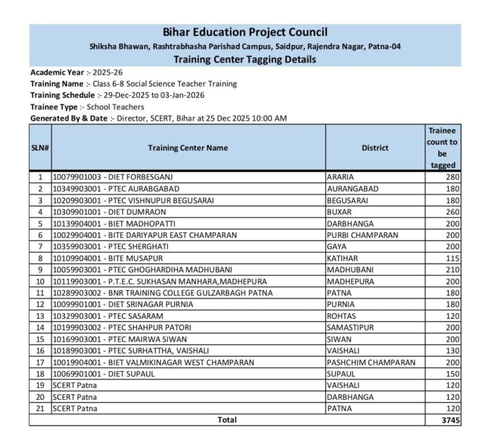 शिक्षा विभाग द्वारा जारी अवकाश तालिका के अनुसार वर्तमान में राज्य में 25 दिसंबर से 31 दिसंबर तक शीतकालीन अवकाश घोषित है। ऐसे समय में शिक्षकों को प्रशिक्षण के लिए बुलाया जाना पूरी तरह से अनुचित एवं अव्यवहारिक है।यह बातें परिवर्तनकारी शिक्षक महासंघ, बिहार के प्रदेश मीडिया प्रभारी मृत्युंजय ठाकुर ने कही।
