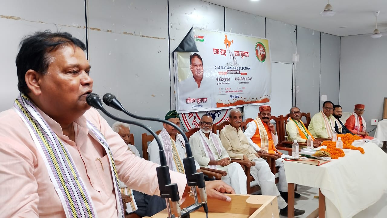 वन नेशन.वन इलेक्शन विषय पर आयोजित गोष्ठी में मुख्य अतिथि पूर्व सांसद रविन्दर कुशवाहा ने एक राष्ट्र एक चुनाव की उपयोगिता बताई। उन्होंने कहा कि एक राष्ट्र एक चुनाव से कई तरह के फायदे होंगे। इससे प्रशासनिक और आर्थिक दक्षता बढ़ेगी। विकास कार्यों में निरंतरता आएगी। राजनीतिक स्थिरता मिलेगी और चुनावी खर्च में भी कमी आएगी। उन्होंने बताया कि बार-बार चुनाव से एकात्मकता कम हो रही है। इससे राष्ट्रवाद कमजोर हो रहा है। यह राष्ट्रीय अखंडता के लिए ठीक नहीं है। उन्होंने कहा कि अलग-अलग समय पर होने वाले चुनावों से आम आदमी का जीवन प्रभावित होता है। एक देश एक चुनाव को जन आंदोलन बनाना जरूरी है। इसे गांव-गांव तक पहुंचाना चाहिए। इससे राष्ट्र और समाज मजबूत होगा।