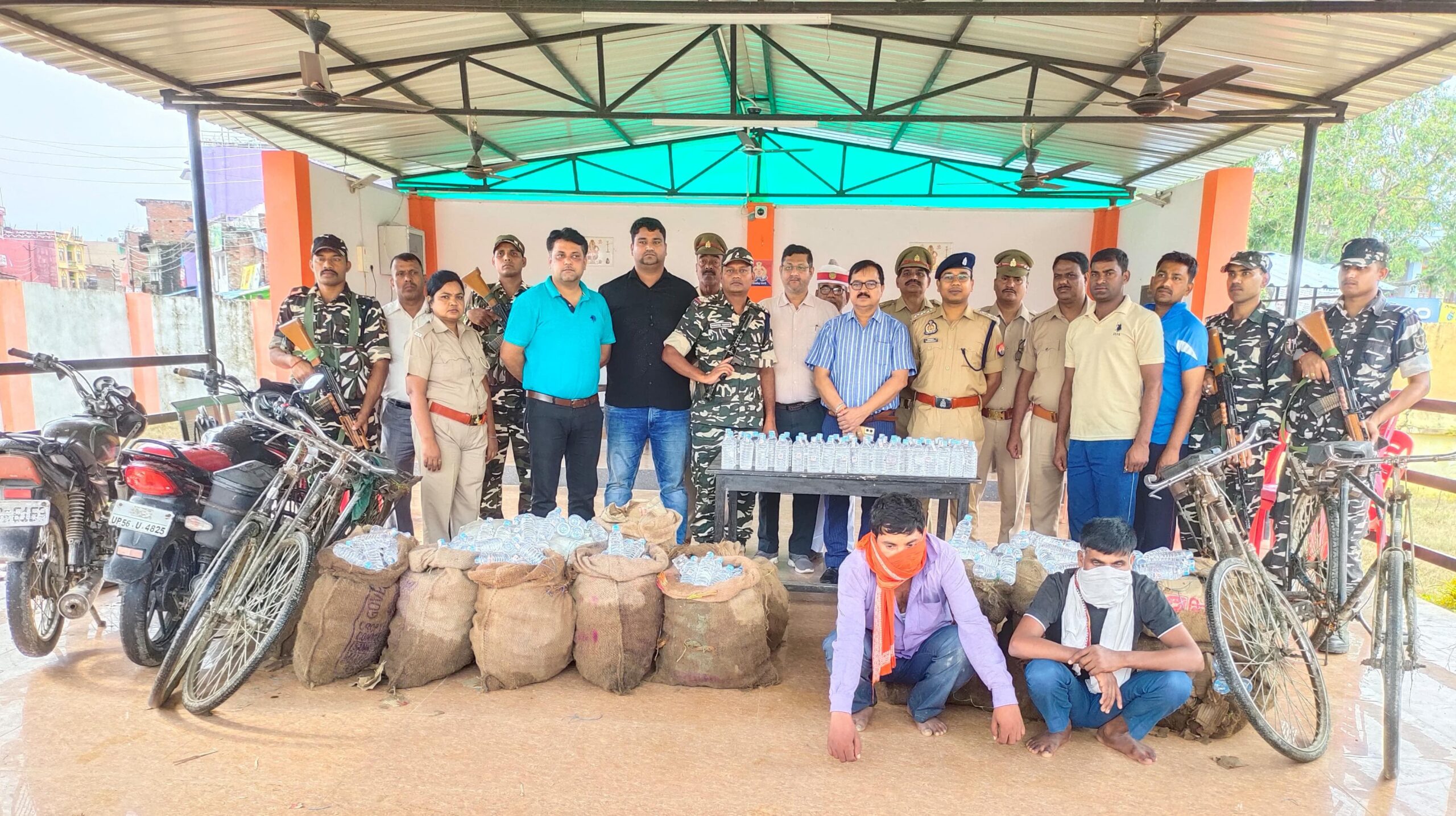 निचलौल एसडीएम सत्यप्रकाश मिश्रा व पुलिस क्षेत्राधिकारी अनिरुद्ध कुमार संयुक्त रूप से प्रेस वार्ता कर बताया कि मुखबिर की सूचना पर एसएसबी, आबकारी विभाग और कोतवाली पुलिस की संयुक्त टीम ने सीमा पार से अवैध रूप से लाए गए नेपाली शराब की खेप की खोज में थाना क्षेत्र अंतर्गत ग्रामसभा डिगही में एक गन्ने की खेत के समीप से 900 शीशी किसमिस ब्रांड का नेपाली शराब, दो साइकिल सहित दो अभियुक्तों को गिरफ्तार किया है। पकड़े गए अभियुक्तों की निशानदेही पर बगल के गांव बेलवा में छापेमारी कर एक घर से 1214 शीशी किसमिस ब्रांड नेपाली शराब की खेप, दो साइकिल और दो बाइक बरामद हुआ। पकड़े गए अभियुक्तो ने अपना नाम क्रमशः राकेश गोंड पुत्र रामचंद्र गोंड उम्र 36 वर्ष और सलीम मंसूरी पुत्र रमजान उम्र 40 वर्ष निवासी बेलवा थाना ठूठीबारी बताया है। क्षेत्राधिकारी अनिरुद्ध कुमार ने बताया कि दोनों अभियुक्तों के विरुद्ध आबकारी एक्ट धारा 60/63 के तहत मुकदमा दर्ज कर विधिक कार्रवाई की जा रही है।बरामदगी टीम में आबकारी इंस्पेक्टर वैभव कुमार यादव, का0 प्रदीप कुमार, बृजेश पाल, मनोज कुमार, एसएसबी इंस्पेक्टर मुकेश कुमार, राजन कुमार, पवन कुमार रजक, राकेश धाकड़, सुशील सिंह, विपिन कुमार, कोतवाली प्रभारी उमेश कुमार, एसआई राजेश सिंह, राज नारायण सिंह, राहुल यादव, योगेश शर्मा मुख्य रूप से शामिल रहे है।