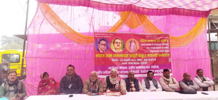 बरठा चौराहा/देवरिया (राष्ट्र की परम्परा)। शनिवार को बरठा चौराहा पर राष्ट्रीय समानता दल, सीपीआई सहित अन्य संगठनों के तत्वावधान में भारत रत्न जननायक कर्पूरी ठाकुर की जयंती श्रद्धा और सम्मान के साथ मनाई गई। इस अवसर पर “वंचित समाज की आवाज—बाबा साहब डॉ. भीमराव अंबेडकर, बाबू जगदेव प्रसाद कुशवाहा एवं जननायक कर्पूरी ठाकुर” विषय पर एक विचार गोष्ठी का आयोजन किया गया।