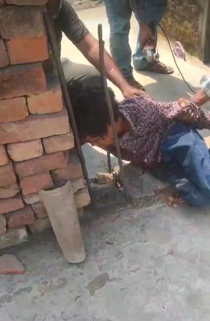 हर्ष की आवाज सुनकर परिजन दौड़े और उसे उस हालत में देखकर अफरा-तफरी मच गई। आनन-फानन में स्थानीय लोगों की मदद से सरिया को छत से काटा गया। इसके लिए पहले पुलिस को बुलाया गया, जिसके बाद लोहे काटने वाली मशीन से सरिया काटकर बच्चे को उसी स्थिति में जिला अस्पताल पहुंचाया गया।