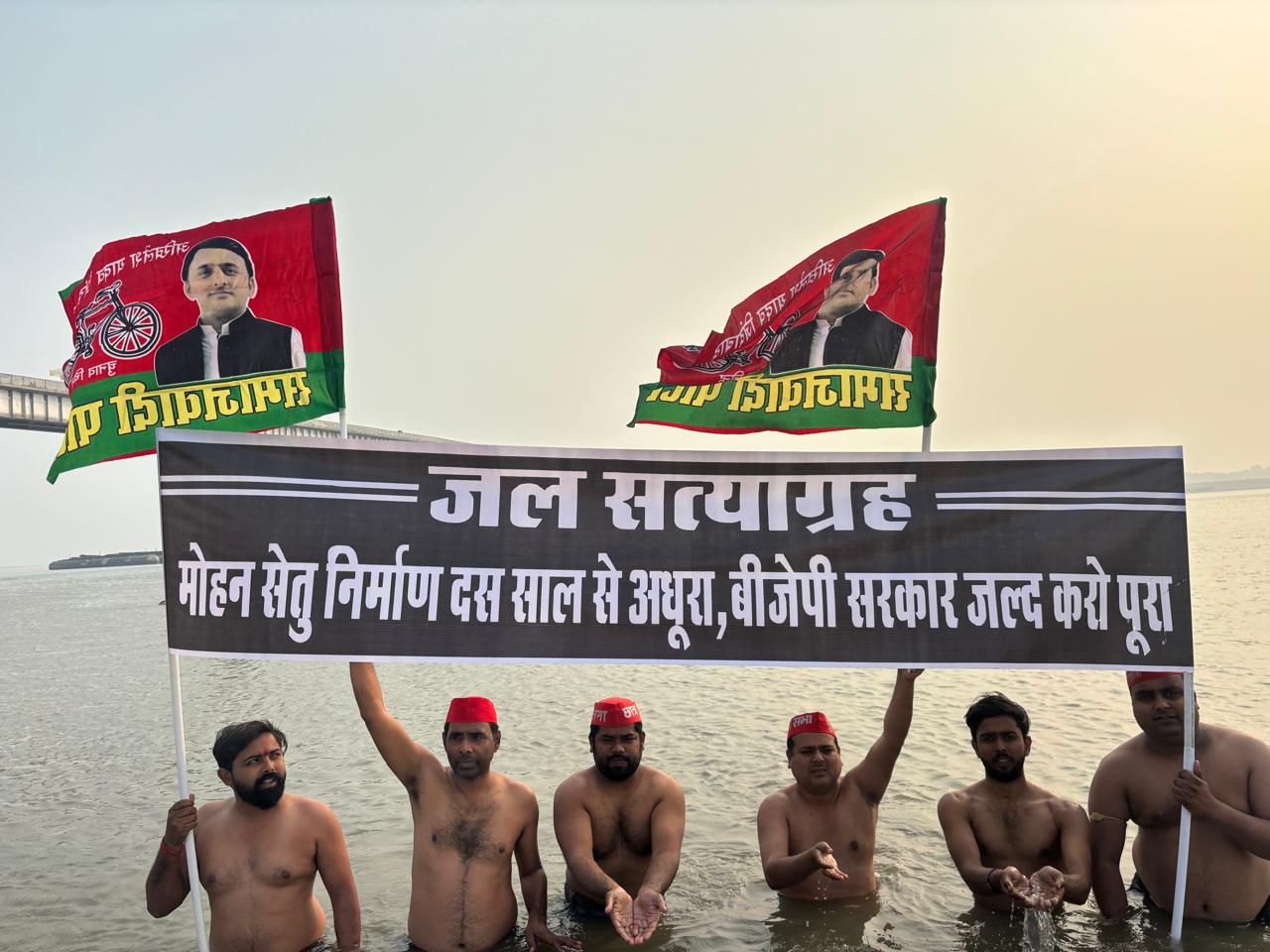 सोमवार को समाजवादी पार्टी के युवा फ्रंटल संगठनों के कार्यकर्ताओं ने सपा नेता विजय रावत के नेतृत्व में मोहन सेतु निर्माण कार्य को जल्द पूरा कराने की मांग को लेकर, मोहन सेतु के नीचे नदी के पानी में जल सत्याग्रह कर नग्न प्रदर्शन किया।