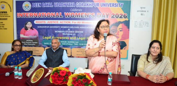 गोरखपुर (राष्ट्र की परम्परा)। दीन दयाल उपाध्याय गोरखपुर विश्वविद्यालय में अंतरराष्ट्रीय महिला दिवस 2026 के अवसर पर “राइट्स. जस्टिस. एक्शन. फॉर ऑल वीमेन एंड गर्ल्स.” थीम के अंतर्गत “लीगल अवेयरनेस एंड लीगल हेल्थ” विषय पर गुव्वा हॉल में एक व्यापक कार्यशाला आयोजित की गई। कार्यक्रम का आयोजन गोरखपुर विश्वविद्यालय महिला कल्याण संघ (गुव्वा) एवं महिला अध्ययन केंद्र के संयुक्त तत्वावधान में हुआ, जिसमें विभिन्न संकायों की छात्राओं, शोधार्थियों एवं शिक्षकों की उल्लेखनीय भागीदारी रही।