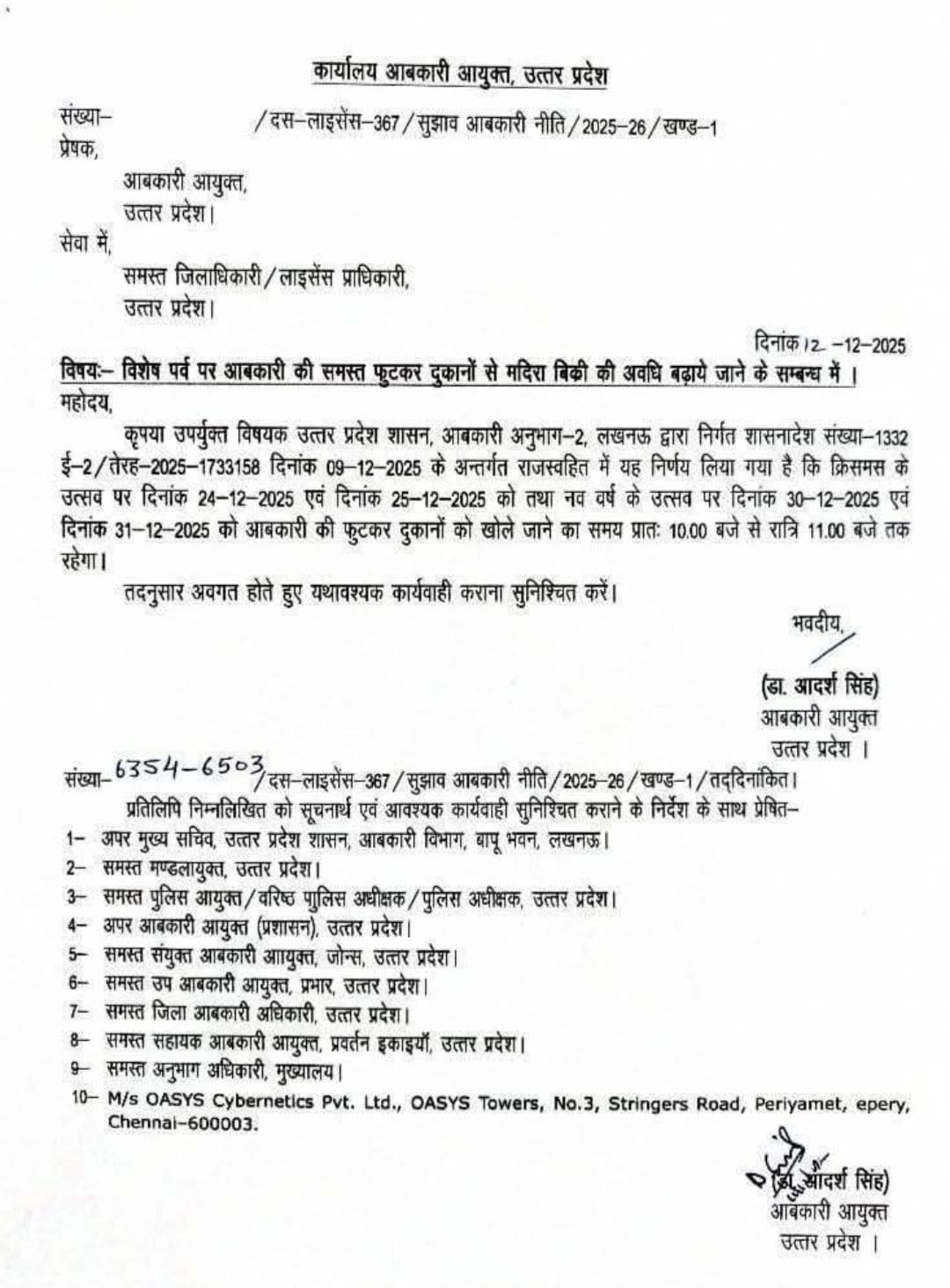 आबकारी विभाग के आदेश के अनुसार, यह निर्णय 24, 25, 30 और 31 दिसंबर के लिए लागू होगा। क्रिसमस और नववर्ष की पूर्व संध्या को देखते हुए यह कदम उठाया गया है, जब आमतौर पर देर रात तक मांग बढ़ जाती है।