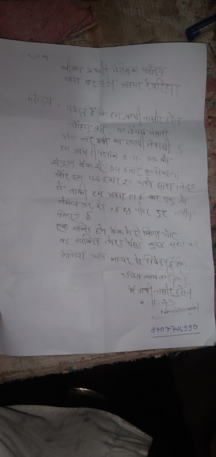 नगर पालिका अंतर्गत पटेल नगर पूर्वी निवासी नासिर हुसैन पुत्र मोहम्मद तैयब अंसारी ने बरहज थाने में तहरीर देकर अवगत कराया कि गुरुवार , 9/11/2023 को सेंट्रल बैंक से 34000 निकाला , जबकि पहले से मेरे पास 1,66000रू था, दोनों राशि मिलाकर कुल राशि ₹2,00000रू मेरे पास था, ताकि मैं अपना एम ई करा सकूं। गोरखपुर से 25 किलोमीटर दूर मैंने जमीन लिया है। बैंक से पैसा निकालने के बाद एक अपरिचित व्यक्ति ने मुझे कुछ सुघा कर मेरा सारा पैसा ले लिया है। पत्रक प्राप्त होने के साथ ही मौके पर पहुँच कर बरहज पुलिस ने सेंट्रल बैंक के सीसीटीवी को खंगाला और आगे के कार्यवाही जुट गई।