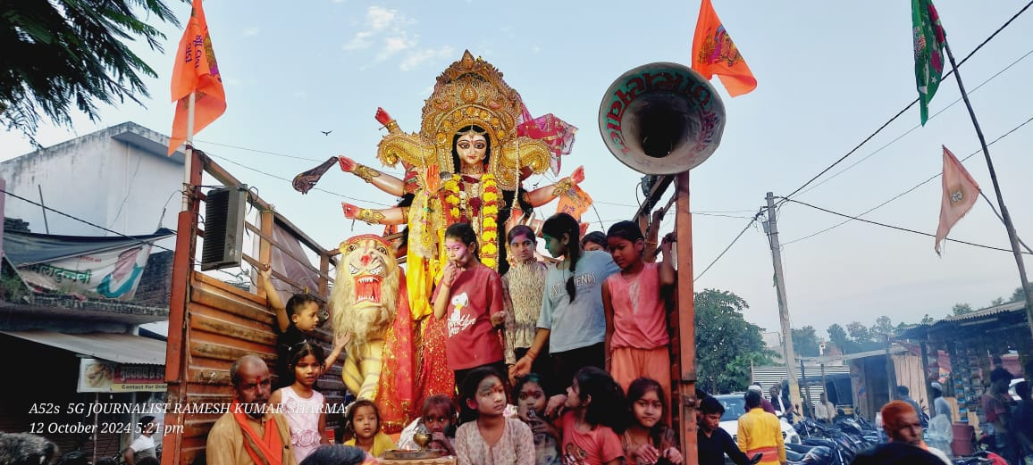 सादुल्लानगर/बलरामपुर(राष्ट्र की परम्परा)। शारदीय नवरात्रि के पावन पर्व पर जनपद के विभिन्न स्थानों पर रखी दुर्गा प्रतिमाओं का विसर्जन बड़े ही हर्षोउल्लास के साथ देर रात्रि तक किया गया। शनिवार को 10 दिवसीय पूजनोत्सव का समापन हुआ। दुर्गा पूजा पंडालों में विराजमान मां भगवती दरबार की मूर्तियों का विभिन्न घाटों में विसर्जन किया गया। वाहनों पर प्रतिमाओं को सजाकर भक्ति गीतों की धुन पर नाचते गाते शोभायात्रा के साथ ले जाया गया। कुछ प्रतिमाओं का कुशमौरा घाट, सुंदर घाट, पिपरा घाट तो कुछ अयोध्या धाम में वैदिक रीति रिवाज से प्रतिमाओं को विसर्जित किया। जय माता दी के जयकारे से नगर गुंजायमान रहा। बड़ी संख्या में नवयुवक डीजे की धुन पर झुम रहे थे। भक्ति गीतों की धुनों पर महिलाएं बच्चे भी थिरक रहे थे। भगवा ध्वज लहराते, चुनरी माथे पर बांधे नवयुवक सजे रथों के आगे-आगे चल रहे थे। भजन-कीर्तन और बैंडबाजों, डीजे संग शोभायात्रा नगर के विभिन्न सड़कों,चौराहों से होता हुआ गंतव्य की ओर समारोह पूर्वक ले जाया जा रहा था। जगह-जगह रथों पर सजी झांकियों के दर्शन के लिए नगरवासी घरों से निकल पड़े थे। माताओं और बहनों ने भवनों के छज्जों से शोभायात्रा का दर्शन कर रही थी। प्रत्येक झांकी के साथ रंग गुलाल उड़ाते भजन की धुनों पर नाचते गाते भक्तों की टोली भगवती को विदा करने सड़क पर उतरी थी। एक विशाल शोभायात्रा नगर का भ्रमण किया। सड़क पर हर जगह दुर्गा माता की झांकी के दर्शन पूजन के लिए लोग सड़कों पर खड़े थे। घंटा-घड़ियाल, शंखध्वनि के साथ श्रद्धालु मूर्ति विसर्जन के लिए श्रद्धा, निष्ठा के साथ जा रहे थे। जगह-जगह प्रसाद वितरण के साथ मां भगवती की झांकी चल रही थी। शारदीय नवरात्र की नवमी के दिन शुक्रवार को माता का अनुष्ठान व्रत पूर्ण हो गया था। शनिवार को परंपरा के अनुसार नगर भ्रमण कर सादुल्ला नगर हनुमानगढ़ी चौराहे पर रावण का दहन कर स्थापित मूर्तियों को देर रात्रि अयोध्या धाम में विसर्जन के लिए ले जाया गया। दुर्गा प्रतिमा विसर्जन में सुरक्षा व्यवस्था को लेकर भारी संख्या में पुलिस बल मौजूद रही।