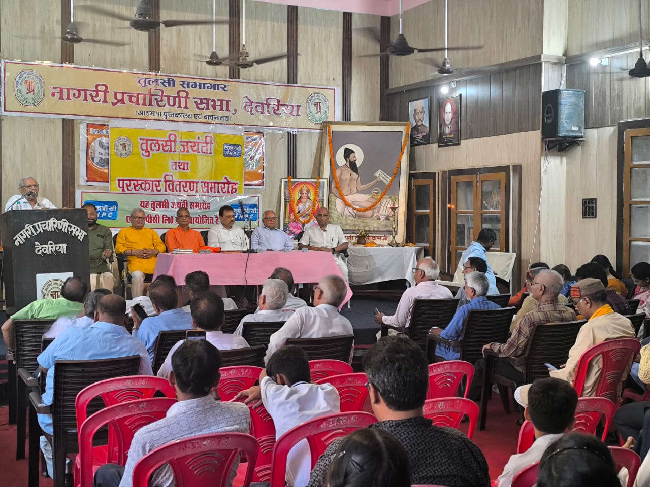 देवरिया (राष्ट्र की परम्परा)। नागरी प्रचारिणी सभा देवरिया द्वारा महाकवि तुलसीदास की जयन्ती पर श्रद्धा व उत्साहपूर्वक कार्यक्रम आयोजित किया गया। प्रातः 8 बजे रामचरित मानस व तुलसीदास जी का पूजन, सुन्दरकाण्ड व हनुमान चालीसा का पाठ हुआ। मुख्य समारोह अपराह्न में मां शारदा व तुलसीदास के चित्र पर माल्यार्पण व दीप प्रज्वलन के साथ प्रारम्भ हुआ। मुख्य अतिथि प्रो. वशिष्ठ ‘अनूप’ (अध्यक्ष, हिन्दी विभाग, काशी हिन्दू विश्वविद्यालय) व विशिष्ट अतिथि स्वामी आन्जनेय दास जी (पीठाधीश्वर, अनंत आश्रम बरहज) रहे। स्वामी आन्जनेय दास ने तुलसी को महान मन वाला बताते हुए कहा कि उन्होंने भारतीय संस्कृति को जोड़ा। प्रो. वशिष्ठ अनूप ने तुलसी के जीवन को संघर्ष और लोकचेतना का प्रतीक बताया व प्रेमचंद को यथार्थ का साहित्यकार कहा। इससे पूर्व सरस्वती वंदना, स्वागत गीत और कविता पाठ हुए। सभा के मंत्री डॉ. अनिल कुमार त्रिपाठी ने सभी अतिथियों का स्वागत किया और अध्यक्षीय वक्तव्य डॉ. जयनाथ मणि त्रिपाठी ने दिया। संचालन डॉ. अभय कुमार द्विवेदी ने किया।समारोह में विशिष्टजनों की उपस्थिति रही और प्रतियोगिता में सफल छात्र-छात्राओं को प्रमाण पत्र व पुस्तकें भेंट कर सम्मानित किया गया। अंत में राष्ट्रगान के साथ कार्यक्रम का समापन हुआ।