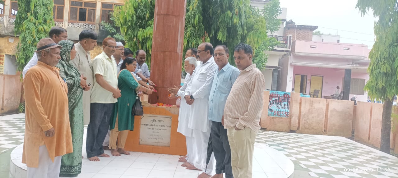 अगस्त क्रांति दिवस पर जनपद स्थित शहीद स्मारक पर शहीदों को पुष्पांजलि अर्पित कर नमन किया गया,तथा नगर पालिका पहुँचकर राष्ट्रपिता महात्मा गांधी की आदमकद प्रतिमा पर पुष्प अर्पित कर श्रद्धा सुमन अर्पित किया गया। उसके पश्चात स्वतंत्रता संग्राम सेनानी स्वर्गीय रंगलाल यादव की धर्म पत्नी शांति देवी को शाल ओढ़ा कर सम्मानित किया गया।