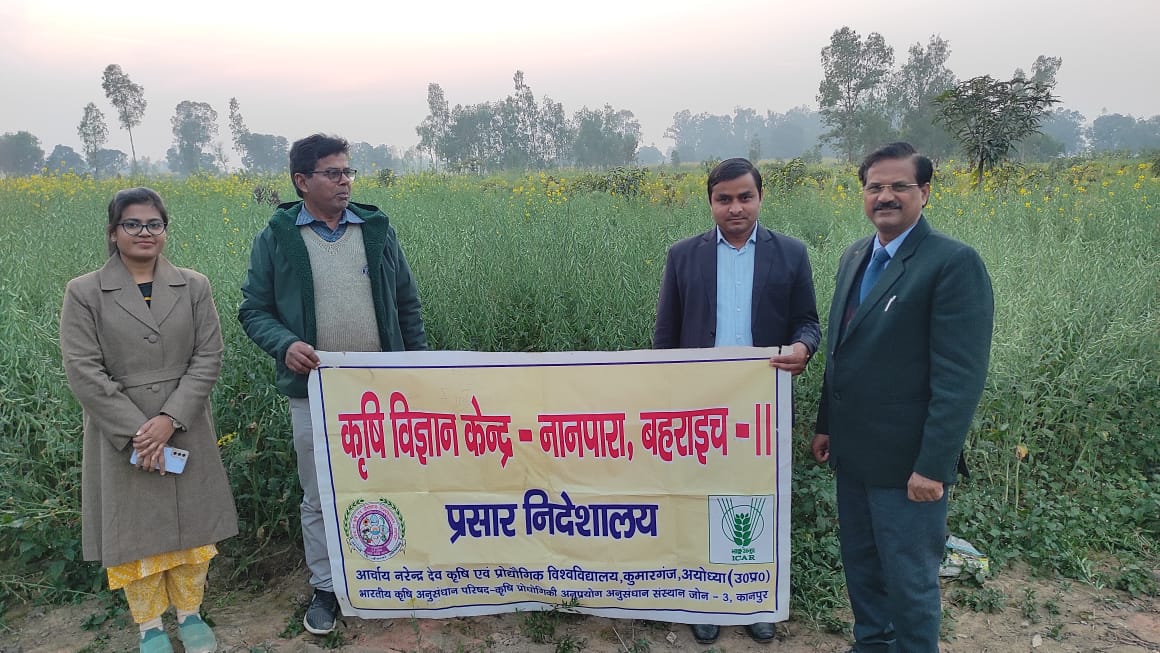 बहराइच (राष्ट्र की परम्परा)l आचार्य नरेंद्र देव कृषि एवं प्रौद्योगिक विश्वविद्यालय कुमारगंज, अयोध्या द्वारा संचालित कृषि विज्ञान केंद्र, नानपारा के वरि. वैज्ञानिक एवं अध्यक्ष डॉ केएम सिंह ने बताया कि जब सरसों व लाही के खेत में फूल डूबने की अवस्था पर पानी नहीं लगाना चाहिए। पादप प्रजनन वैज्ञानिक डॉ अरुण कुमार ने सरसों में बीज बनने की प्रक्रिया को कैसे बढ़ाया जाए इसके बारे में बताया यदि बीज बनने की प्रक्रिया तेज गति से होगी तभी सरसों का उत्पादन भी अधिक होगा। सरसों में परागण की प्रक्रिया मधुमक्खी के द्वारा होती है, यदि किसान भाई मधुमक्खी पालन सरसों के खेत के आसपास करते हैं, तो उन्हें शहद का उत्पादन भी मिलेगा और सरसों में बीज बनने की प्रक्रिया के लिए पराग मधुमखियों द्वारा तेज गति से करेंगी, जिससे सरसों का उत्पादन भी अधिक होगा।