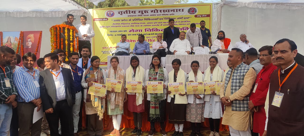 बहराइच (राष्ट्र की परम्परा)l नेशनल मेडिकोज आर्गनाइजेशन द्वारा जनपद बहराइच में आयोजित तृतीय गुरु गोरखनाथ स्वास्थ्य सेवा यात्रा के समापन अवसर पर मुख्य अतिथि प्रदेश के राज्य मंत्री (स्वतंत्र प्रभार) उद्यान, कृषि विपणन, कृषि विदेश व्यापार एवं कृषि निर्यात, दिनेश प्रताप सिंह ने एमएलसी डाॅ. प्रज्ञा त्रिपाठी, विधायक महसी सुरेश्वर सिंह, पयागपुर के सुभाष त्रिपाठी, भाजपा जिलाध्यक्ष श्यामकरन टेकड़ीवाल व अन्य अतिथियों के साथ दीप प्रज्ज्वलित कर तथा माँ सरस्वती के चित्र पर माल्यार्पण कर स्व. ठाकुर हुकुम सिंह किसान स्नातकोत्तर महाविद्यालय के प्रांगण में आयोजित निःशुल्क मेगा चिकित्सा शिविर का शुभारम्भ किया। शिविर के दौरान लगभग 1000 मरीज़ों का स्वास्थ्य परीक्षण कर आवश्यकतानुसार दवाओं का निःशुल्क वितरण किया गया। शिविर के दौरान मोतियाबिन्द के लगभग 150 मरीज़ भी चिन्हित किये गये।