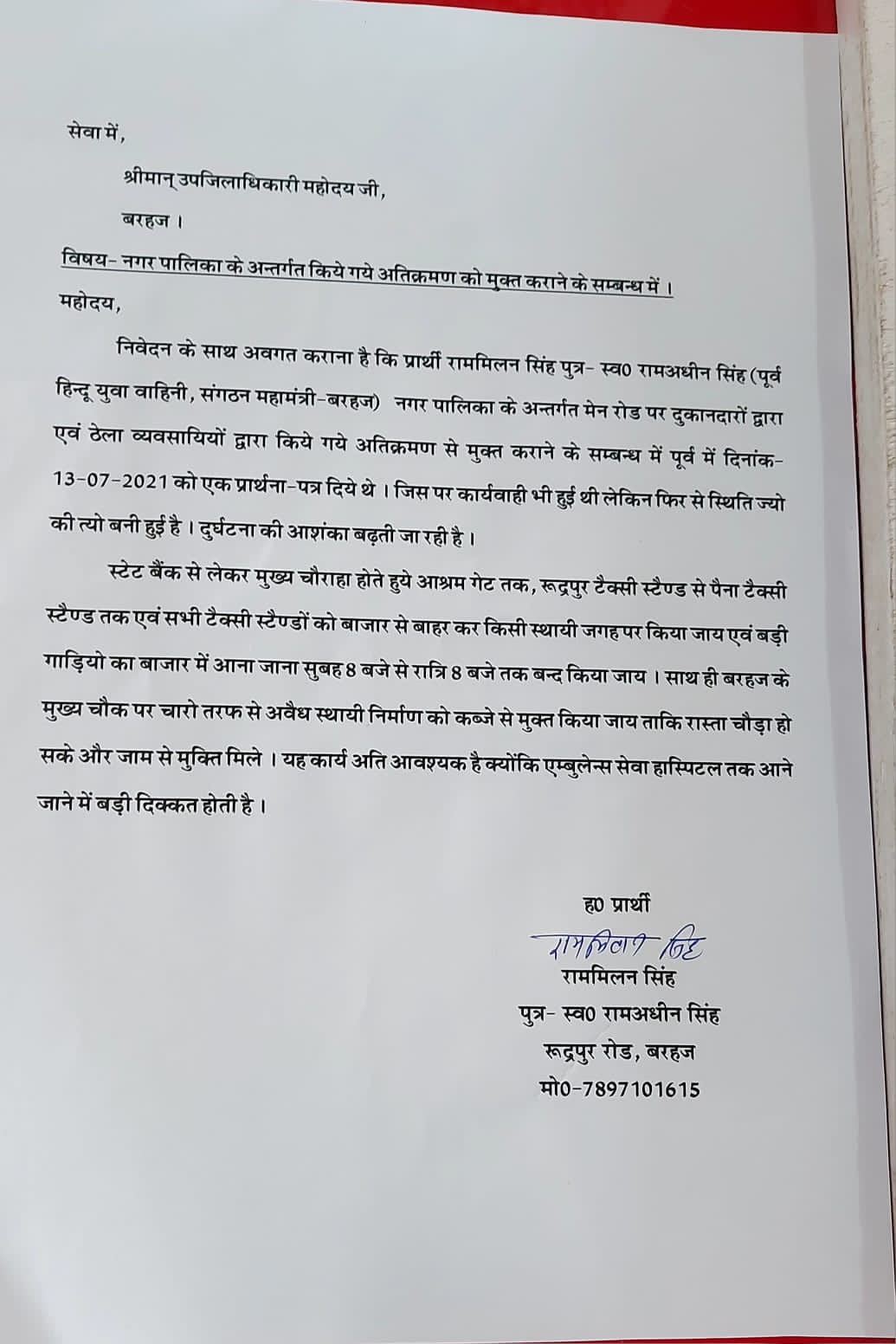 और तो और सरयू तट पर स्थित घाटों पर रेहड़ी वालो के अतिक्रमण से पूजा पाठ करने आये श्रद्धालुओं को भी काफी दिक्कतों का सामना करना पड़ता है। जहां एक तरफ दुकानदार अपनी दुकानों को आगे बढ़ा कर सड़क पर अतिक्रमण किए हुए हैं वही ठेला खोमचा लगाने वाले और ई रिक्शा वाले बेतरतीब गाड़ियों को खड़ा कर आने जाने में व्यवधान उत्पन्न करते रहते हैं, रेलवे तिराहे से लेकर सामुदायिक स्वास्थ्य केंद्र बरहज तक सामुदायिक स्वास्थ्य केंद्र की एंबुलेंस मरीजों को लेकर जब देवरिया निकलती हैं तो उसे जाम की समस्या से एक दो होना पड़ता हैं, जिससे मरीजो को परेशानी उठानी पड़ती है। इन सभी समस्याओं को ध्यान में रखकर राम मिलन सिंह ने उप जिला अधिकारी बरहज को पत्रक देकर, इस समस्या से निजात दिलाने की मांग की है। इसके पहले भी 13 जुलाई 2023 को एक पत्र दिया था जिसको लेकर हल्का-फुल्का शासन द्वारा प्रयास किया गया था, लेकिन पुनः वही स्थिति आ गई है किसी दिन नगर में कोई बड़ी घटना हो सकती है इसको लेकर पुनः एक बार उन्होंने उप जिलाधिकारी को ज्ञापन सौंपा है और मांग की है कि यथाशीघ्र इस पर कार्यवाही कर रास्तों को ठीक कराया जाए, जिससे आने जाने वाले को कहीं से कोई समस्या ना हो।