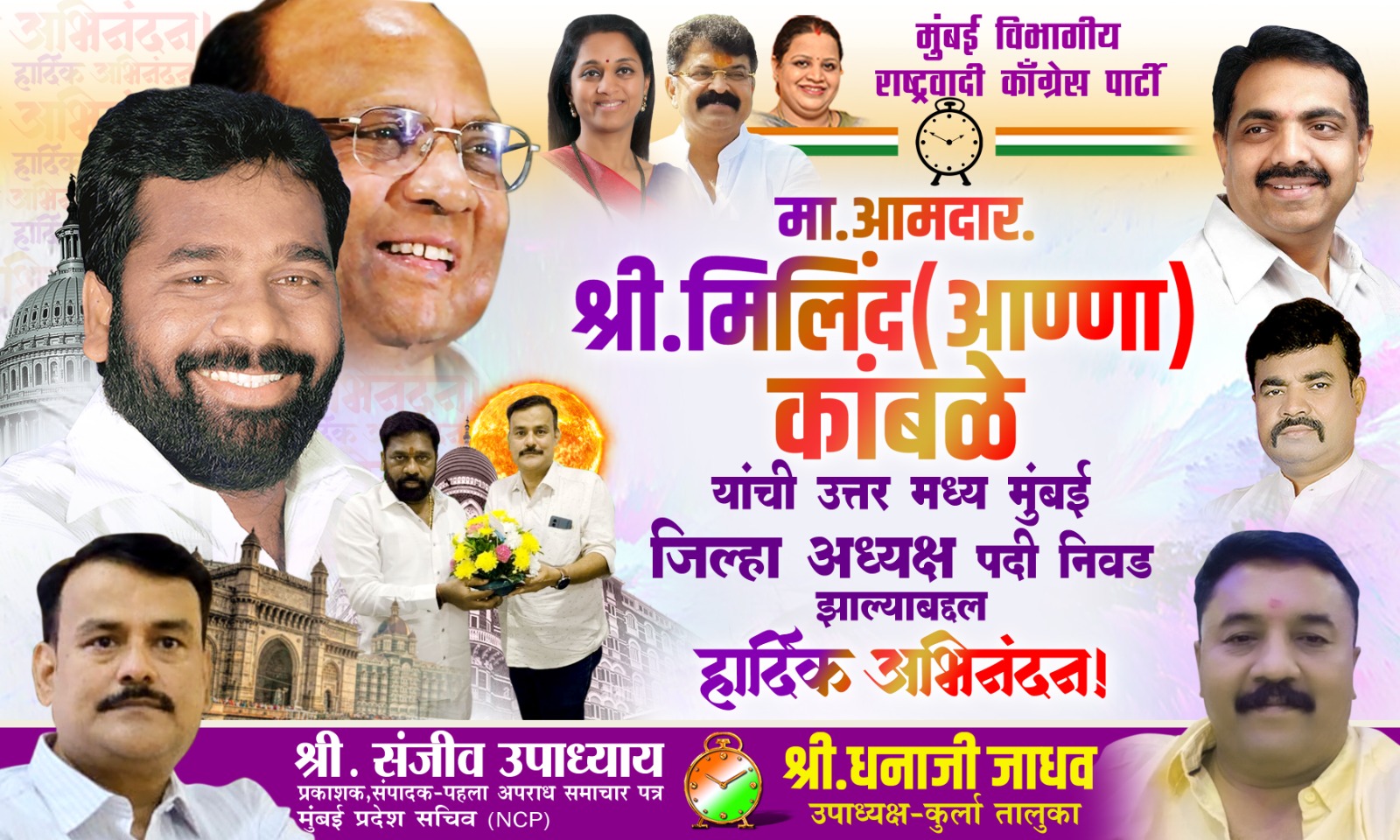 राष्ट्रवादी कांग्रेस पार्टी के उत्तर मध्य मुम्बई जिलाध्यक्ष पद पर मिलिंद अण्णा कांबले को कर लिया गया है। इससे पहले इनको राकांपा द्वारा तालुका अध्यक्ष की जिमेदारी दी गयी थी, इनके मेहनत लगन व पार्टी के प्रति निष्ठा को देखते हुये राष्ट्रवादी काँग्रेस पार्टी के अध्यक्ष व सांसद शरद पवार के आशीर्वाद प्रदेश अध्यक्ष और पूर्व मंत्री जयंत पाटिल के अनुसंशा के आधार पर व राकांपा मुम्बई की कार्याध्यक्ष राखी जाधव की संस्तुति पर इन्हे उत्तर मध्य मुम्बई जिलाध्यक्ष बनाया गया है। मिलिंद अण्णा कांबले को राकांपा उत्तरमध्य मुंबई जिला अध्यक्ष नियुक्त किए जाने पर उत्तर भारतीय समाज के नेता (राकांपा ) सचिव व सा.पहला अपराध समाचार पत्र के संपादक संजीव उपाध्याय ने एनसीपी श्रमिक भवन कुर्ला स्थित कार्यालय जाकर फूल का गुलदस्ता देकर उन्हें बधाई दी