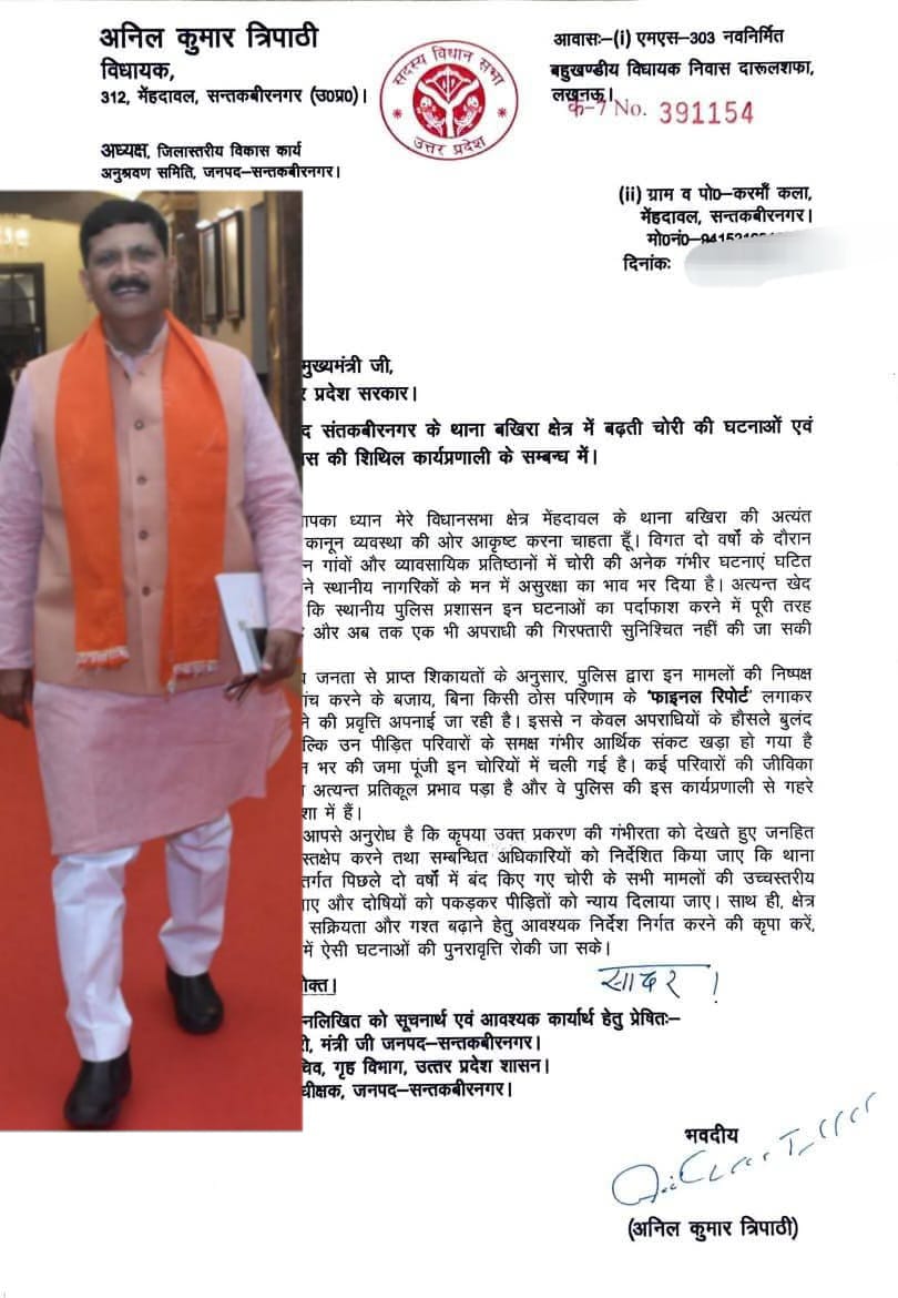 विधायक अनिल कुमार त्रिपाठी ने पत्र में उल्लेख किया है कि बीते दो वर्षों से बखिरा थाना क्षेत्र में लगातार चोरी की घटनाएं सामने आ रही हैं, लेकिन स्थानीय पुलिस न तो किसी मामले का खुलासा कर पाई है और न ही अपराधियों पर प्रभावी कार्रवाई हुई है। अधिकांश मामलों में फाइनल रिपोर्ट लगाकर फाइलें बंद कर दी गईं, जिससे अपराधियों के हौसले और बुलंद हुए हैं।