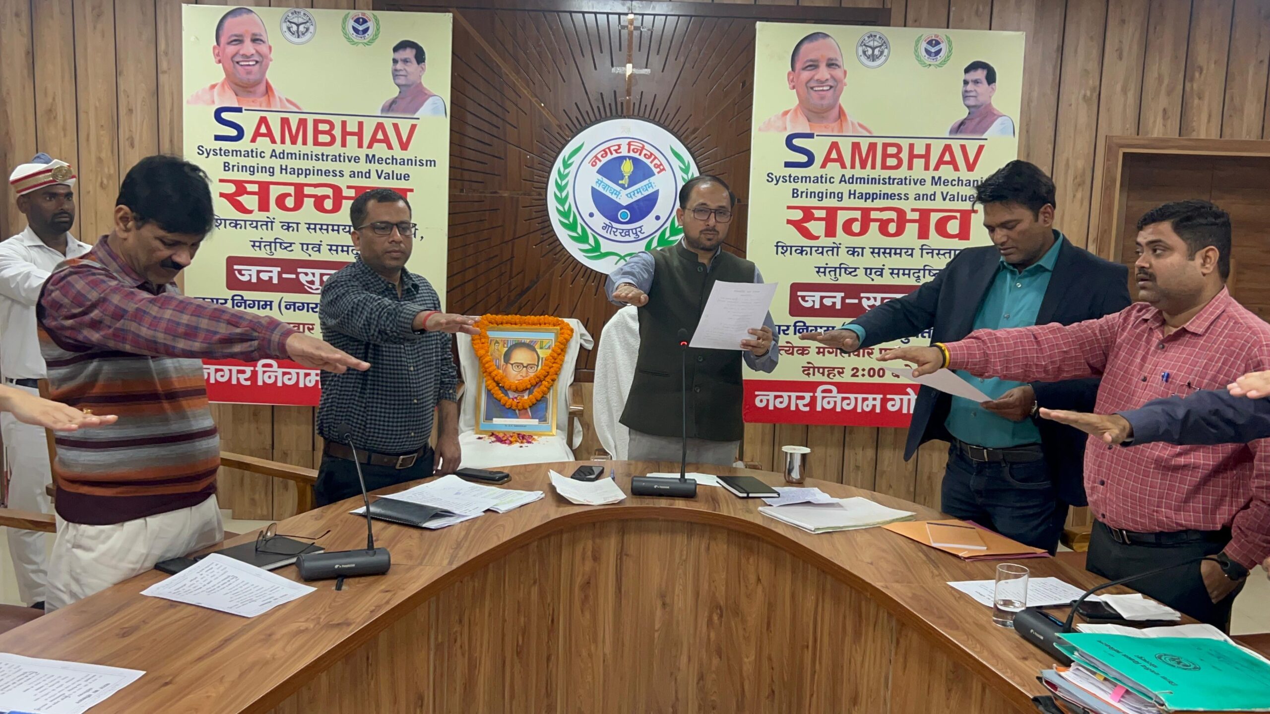 गोरखपुर (राष्ट्र की परम्परा) l। संविधान दिवस के अवसर पर नगर निगम सभागार में आयोजित कार्यक्रम में, नगर आयुक्त गौरव सिंह सोगरवाल एवं अन्य अधिकारियों द्वारा डॉ भीमराव अंबेडकर के चित्र पर माल्यार्पण किया गया। तत्पश्चात नगर आयुक्त एवं अन्य अधिकारी कर्मचारियों द्वारा संविधान की प्रस्तावना का वाचन किया गया। इस दौरान अपर नगर आयुक्त निरंकार सिंह, सहायक नगर आयुक्त सुरेंद्र सिंह, अविनाश प्रताप सिंह, महाप्रबन्धक जलकल रघुवेंद्र कुमार एवं अन्य अधिकारी व कर्मचारी मौजूद रहे।