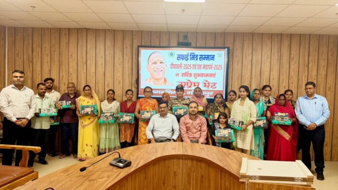 गोरखपुर(राष्ट्र की परम्परा )l नगर निगम परिसर में शनिवार को दीपावली एवं छठ महापर्व के अवसर पर नगर निगम के सफाई कर्मियों एवं समस्त स्टाफ को मिठाई और उपहार भेंट कर सम्मानित किया गया। इस अवसर पर महापौर डॉ मंगलेश श्रीवास्तव नगर आयुक्त गौरव सिंह सोगरवाल और अपर नगर आयुक्त भी उपस्थित रहे।