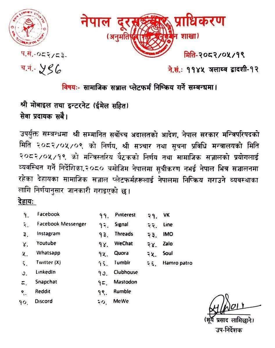 जारी आदेश (प.सं.-०८२/८३, दिनांक – 2082 / 05/19, च.नं.-५९७, ने.सं.: ११४५) के तहत नेपाल में फेसबुक, व्हाट्सएप, इंस्टाग्राम, यूट्यूब, ट्विटर (एक्स), स्नैपचैट, टेलीग्राम, लिंक्डइन, क्वोरा, पिनटेरेस्ट, थ्रेड्स, वीचैट, सिग्नल, डिस्कॉर्ड, रेडिट, टंबलर, क्लबहाउस, वीके, IMO, ज़ालो, मेस्टोडोन और कई अन्य सोशल मीडिया प्लेटफॉर्म तत्काल प्रभाव से निष्क्रिय कर दिए गए हैं।
