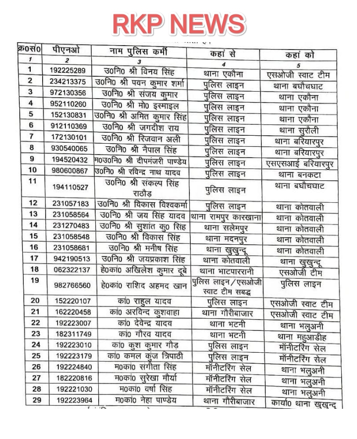 महिला पुलिस कर्मियों में भी व्यापक बदलाव हुए हैं। सगीता सिंह, सुरेखा मौर्या, वर्षा सिंह को थाना भलुअनी में तैनात किया गया है, जबकि कमल कुंज त्रिपाठी और कुश कुमार गौड़ को मॉनिटरिंग सेल में नियुक्त किया गया है।