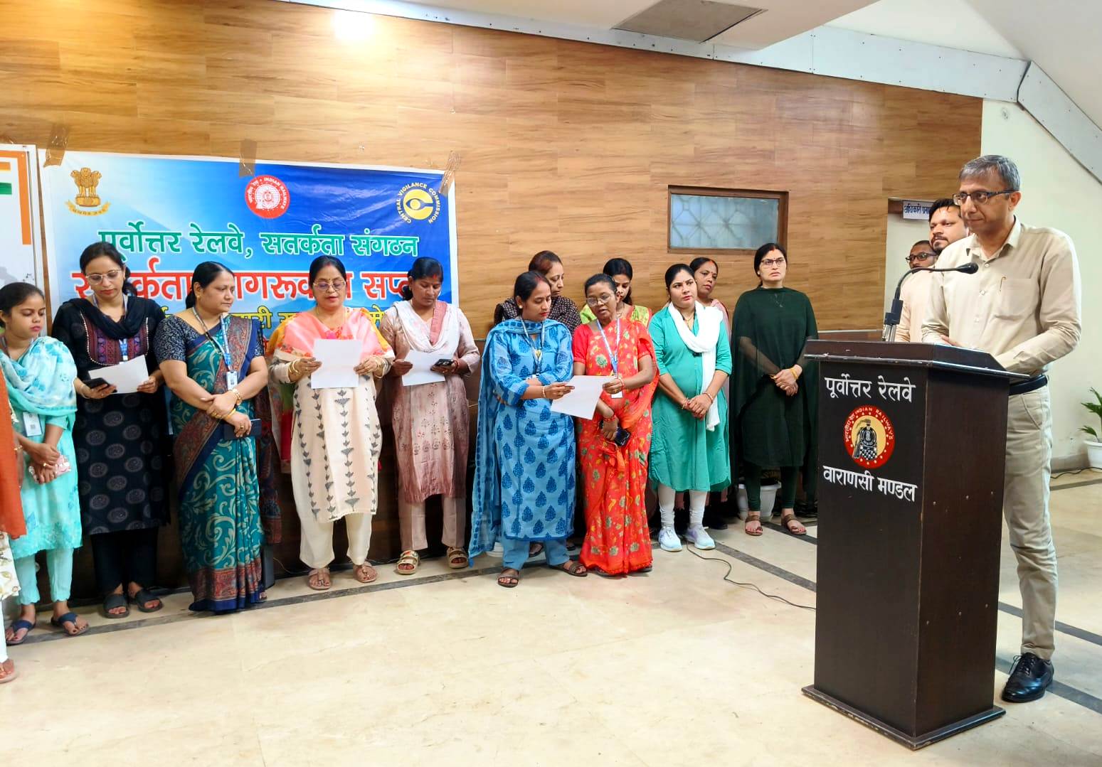 वाराणसी(राष्ट्र की परम्परा)l पूर्वोत्तर रेलवे के वाराणसी मंडल पर 27 अक्टूबर,2025 से 02 नवम्बर,2025 तक सतर्कता जागरूकता सप्ताह मनाया जा रहा है । इसी क्रम में मंडल रेल प्रबंधक,वाराणसी आशीष जैन ने ’’सतर्कता जागरूकता सप्ताह-2025’’ के अन्तर्गत. बुधवार 29 अक्टूबर, को पूर्वाह्न मंडल रेल प्रबंधक कार्यालय के मुख्य प्रवेश द्वार वाराणसी मंडल पर कार्यरत रेल अधिकारियों एवं कर्मचारियों को अपने कार्यकलापों के प्रत्येक क्षेत्र में ईमानदारी और पारदर्शिता बनाये रखने के लिए सत्यनिष्ठा की शपथ दिलाई।