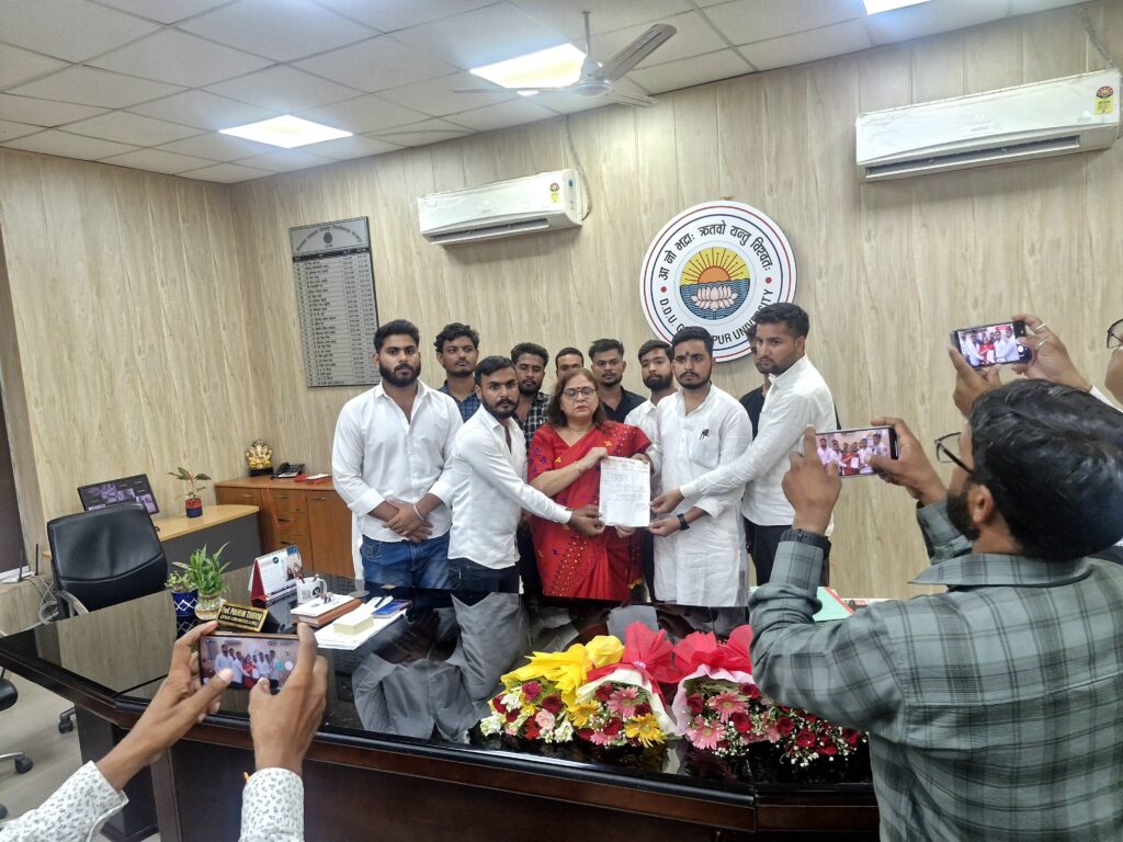 गोरखपुर (राष्ट्र की परम्परा)। शुक्रवार को एनएसयूआई के प्रदेश महासचिव आदित्य शुक्ला के नेतृत्व में छात्रों ने गोरखपुर विश्वविद्यालय के मुख्य द्वार से नारेबाज़ी करते हुए प्रशासनिक भवन पहुंचे, छात्रों की भीड़ को देखते ही विश्वविद्यालय प्रशासन ने प्रशासनिक भवन पर तालाबंदी कर दिया। छात्रनेता आदित्य शुक्ला के नेतृत्व में छात्र वहीं धरने पर बैठ गए दो घंटे तक चले जोरदार प्रदर्शन के बाद मुख्य नियंता छात्रों के बीच पहुंचे, उसके बाद छात्र कुलपति से मिलने के लिए तैयार हुए। आदित्य शुक्ला ने कुलपति से कहा की विश्वविद्यालय छात्रसंघ चुनाव को लेकर अपना पक्ष स्पष्ट करें ,इस बार पीछे हटने के लिए हम तैयार नहीं है, इस बार आर – पार की लड़ाई होगी। विश्वविद्यालय प्रशासन छात्र संघ बहाल कराए या हम छात्र नेताओं को जेल भेज दे। छात्रसंघ चुनाव राजनीति की नर्सरी है और पिछले आठ वर्षों से छात्रसंघ चुनाव नहीं हुए है। विश्वविद्यालय प्रशासन से 1 सप्ताह के अंदर लिखित में अपना पक्ष देने के आश्वासन पर ज्ञापन देकर धरना समाप्त किया गया। इस दौरान अच्युत शुक्ला, रिशु दूबे, ऋषभ सिंह, अमन गौतम, राजवीर सिंह, शेखर यादव, नमन तिवारी, अनस, अरमान, कुलदीप, दिव्यांश,अनिकेत,आदि बड़ी संख्या में छात्र मौजूद रहें।