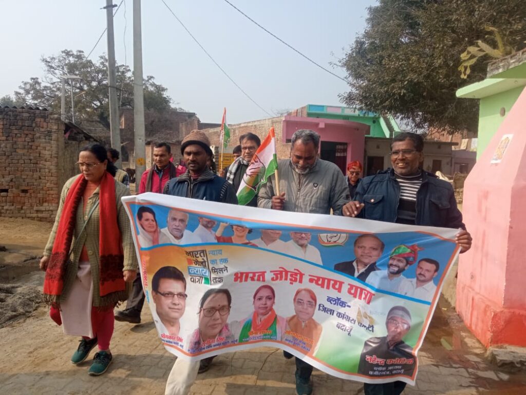 जनपद में समस्त ब्लॉकों पर चल रही न्याययात्रा सोमवार को सभी ब्लाकों पर संचालित रही। ब्लॉक वजीरगंज में वजीरगंज नगर कांग्रेस कमेटी कार्यालय से नगर अध्यक्ष सोमपाल शाक्य एवं ब्लॉक अध्यक्ष नरेंद्र सिंह कठेरिया के नेतृत्व में प्रातः 11:00 बजे से शुरू होकर 2:00 बजे 5 किलोमीटर चलकर मनवा पर समाप्त हुई ।न्याय यात्रा ग्राम हथरा में भी न्याय पंचायत अध्यक्ष राशिद पहलवान के नेतृत्व में निकाली गई। इस कार्यक्रम में जिला कांग्रेस कमेटी अध्यक्ष ओमकार सिंह ,महिला कांग्रेस की जिला अध्यक्ष सुनीता सिंह, जिला कांग्रेस कमेटी के सचिव कल्लू शर्मा प्रधान बदायूं से शहर कांग्रेस कमेटी के महासचिव अकील अहमद भी शामिल रहे। इस अवसर पर मनवा में अंबेडकर पार्क पर यात्रा समापन के उपरांत बाबासाहेब अम्बेडकर की प्रतिमा पर माल्यार्पण कर उन्हें नमन करते हुए वहां पर कांग्रेस जनों ने रामधुन और राष्ट्रगान का भी गायन किया ।इस अवसर पर उपस्थित कार्यकर्ताओं को संबोधित करते हुए जिला कांग्रेस कमेटी अध्यक्ष ओमकार सिंह ने कहा कि आज हमारे नेता राहुल गांधी पुनः भारत जोड़ो न्याय यात्रा पर निकल पड़े हैं और इसमें उनका यही संदेश है कि डरेंगे नहीं झुकेंगे नहीं और सहेंगे भी नहीं यही संदेश हम आपके बीच देने आए हैं कि आप डरो मत, झुको मत ,सहो मत, कांग्रेस पार्टी आपके साथ मजबूती के साथ खड़ी है। इस अवसर पर जिला महिला कांग्रेस के अध्यक्ष सुनीता सिंह ने कहा कि आज भारत जोड़ो न्याय यात्रा में महिलाओं की भी भागीदारी आवश्यक है क्योंकि सबसे ज्यादा अगर सहन करती है तो महिला ही करती है तो महिलाओं को कांग्रेस पार्टी के साथ खड़ा होना चाहिए। कार्यक्रम में महिला कांग्रेस की महासचिव मीना शाक्य नगर कांग्रेस कमेटी, अध्यक्ष सोमपाल शाक्य ,ब्लॉक कांग्रेस कमेटी अध्यक्ष नरेंद्र कठेरिया ने सभी का आभार व्यक्त किया। इस अवसर पर सुनील सिंह ,आरिफ खान, परहलाद कुमार दिनेश पाल, सुरेश, दिनेश, महेंद्र रामपाल, पृथ्वी सिंह, गज्जू सिंह आदि कार्यकर्ता पदाधिकारी उपस्थित रहे।