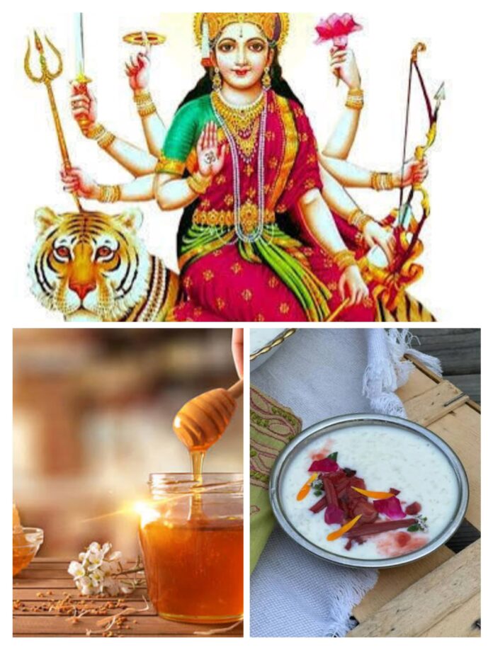 माता को शहद का भोग चढ़ाया जाता है। मान्यता है कि इससे वैवाहिक जीवन में सुख और सौहार्द बना रहता है। - सप्तम दिवस – मां कालरात्रि