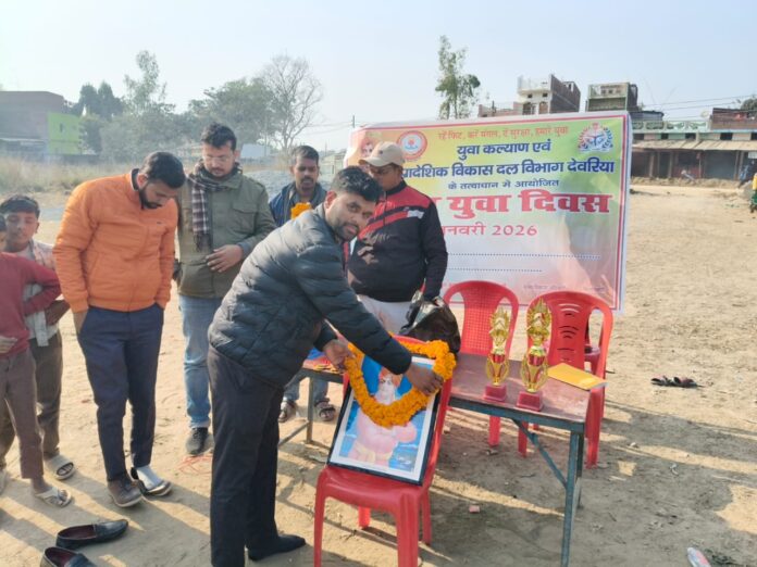 देवरिया।(राष्ट्र की परम्परा)राष्ट्रीय युवा दिवस 2026 के अवसर पर जनपद देवरिया में युवाओं के सर्वांगीण विकास, राष्ट्र निर्माण में उनकी भूमिका और स्वामी विवेकानंद जी के विचारों को आत्मसात करने के उद्देश्य से जिलेभर में विविध आयोजन किए गए। युवा कल्याण विभाग एवं युवक मंगल दलों के संयुक्त तत्वावधान में आयोजित इन कार्यक्रमों में खेल प्रतियोगिताओं, बौद्धिक गोष्ठियों और क्विज के माध्यम से युवाओं में उत्साह और सकारात्मक ऊर्जा देखने को मिली।