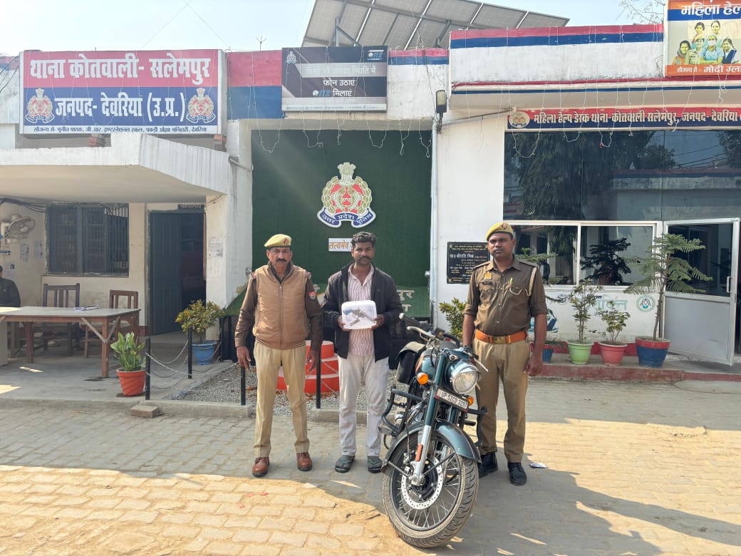 सलेमपुर/देवरिया(राष्ट्र की परम्परा) पुलिस अधीक्षक देवरिया विक्रान्त वीर के निर्देशन में अपराध व अपराधियों की रोकथाम हेतु चलाये जा रहे अभियान के क्रम में थाना सलेमपुर पुलिस द्वारा वाहन चेकिंग के दौरान चेरो मार्ग के पास से एक बुलेट मोटरसाईकिल वाहन सं0 UP 52 CD 3297 सवार व्यक्ति जिसका नाम पता अरविन्द कुशवाहा पुत्र रामप्रीत कुशवाहा निवासी वभनौली पाण्डेय थाना सलेमपुर जनपद देवरिया को एक देशी तमंचा 315 बोर व 02 जिंदा कारतूस 315 बोर के साथ गिरफ्तार किया गया । पुलिस टीम द्वारा बरामद बुलेट वाहन सं0 UP 52 CD 3297 तथा 01 अदद तमंचा व 02 अदद जिंदा कारतूस को कब्जे में लेकर अभियुक्त को गिरफ्तार करते हुए थाना सलेमपुर पर सुसंगत धाराओं में अभियोग पंजीकृत जेल भेजा जा रहा है ।गिरफ्तार करने वाले टीम में उ0नि0 नीरज सिंह यादव ,हे0का0 रमेश चन्द्र ,हे0का0 जितेन्द्र यादव थाना सलेमपुर जनपद देवरिया । शामिल रहे ।