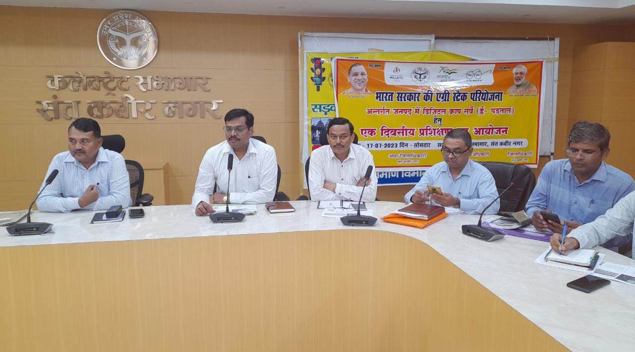 संत कबीर नगर (राष्ट्र की परम्परा)। मुख्य विकास अधिकारी संत कुमार की अध्यक्षता में भारत सरकार की एग्रीस्टैक परियोजना अंतर्गत जनपद में डिजिटल क्रॉप सर्वे (ई-पड़ताल) हेतु एक दिवसीय जनपद स्तरीय प्रशिक्षण का आयोजन कलेक्ट्रेट सभागार में किया गया।इस प्रशिक्षण में नवागत उप कृषि निदेशक डॉक्टर राकेश कुमार सिंह, समस्त उपजिलाधिकारीगण, तहसीलदार, नायब तहसीलदार, जिला कृषि अधिकारी पीसी विश्वकर्मा, भूमि संरक्षण अधिकारी सीपी सिंह, उप संभागीय कृषि प्रसार अधिकारी, सहायक सांख्यिकी अधिकारी, समस्त सहायक विकास अधिकारी कृषि, राजस्व निरीक्षक, प्राविधिक सहायक व लेखपालों द्वारा प्रतिभाग किया गया।