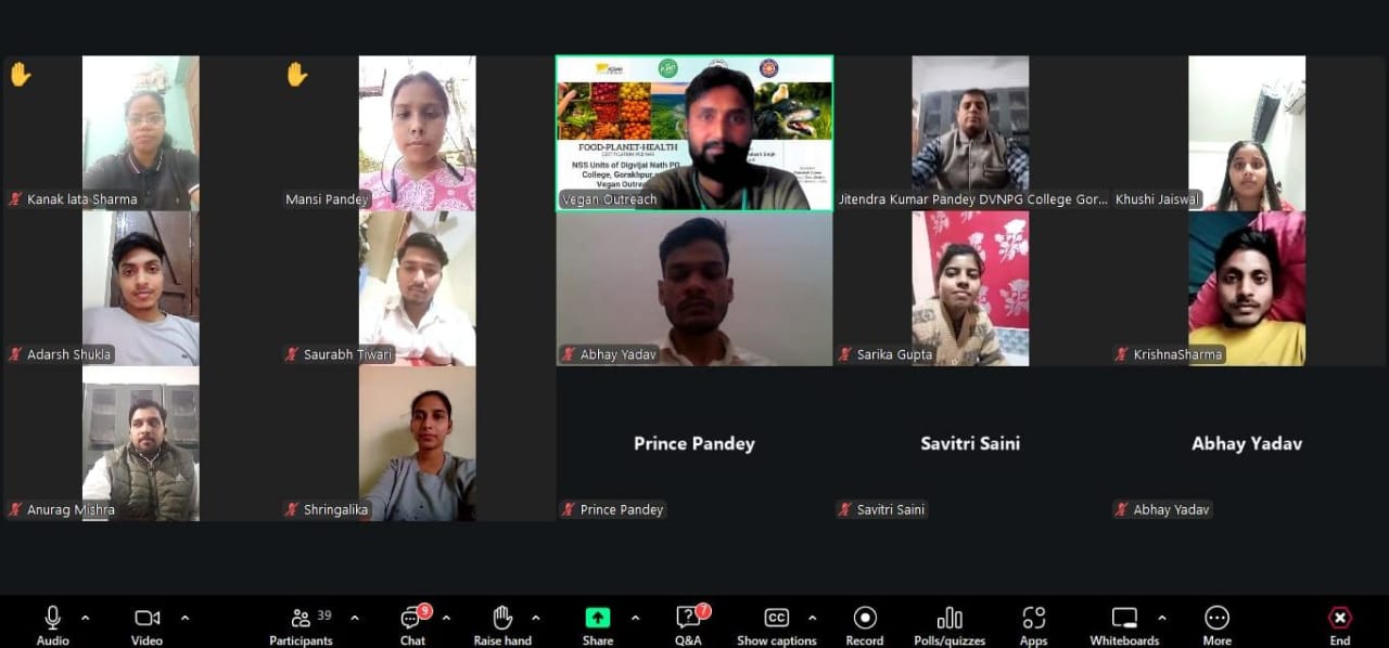 गोरखपुर(राष्ट्र की परम्परा)। वेगन आउटरीच एवं दिग्विजय नाथ पी.जी. कॉलेज, गोरखपुर की राष्ट्रीय सेवा योजना (एन.एस.एस.) की चारो इकाइयों के संयुक्त तत्वावधान में ‘‘फ़ूड–प्लानेट–हेल्थ’’ विषयक एक दिवसीय ऑनलाइन कार्यशाला का सफल आयोजन किया गया। कार्यक्रम का उद्देश्य विद्यार्थियों में भोजन संबंधी आदतों, पर्यावरणीय प्रभावों और स्वास्थ्य के आपसी संबंध को समझाना तथा सतत जीवनशैली के प्रति जागरूकता बढ़ाना था।