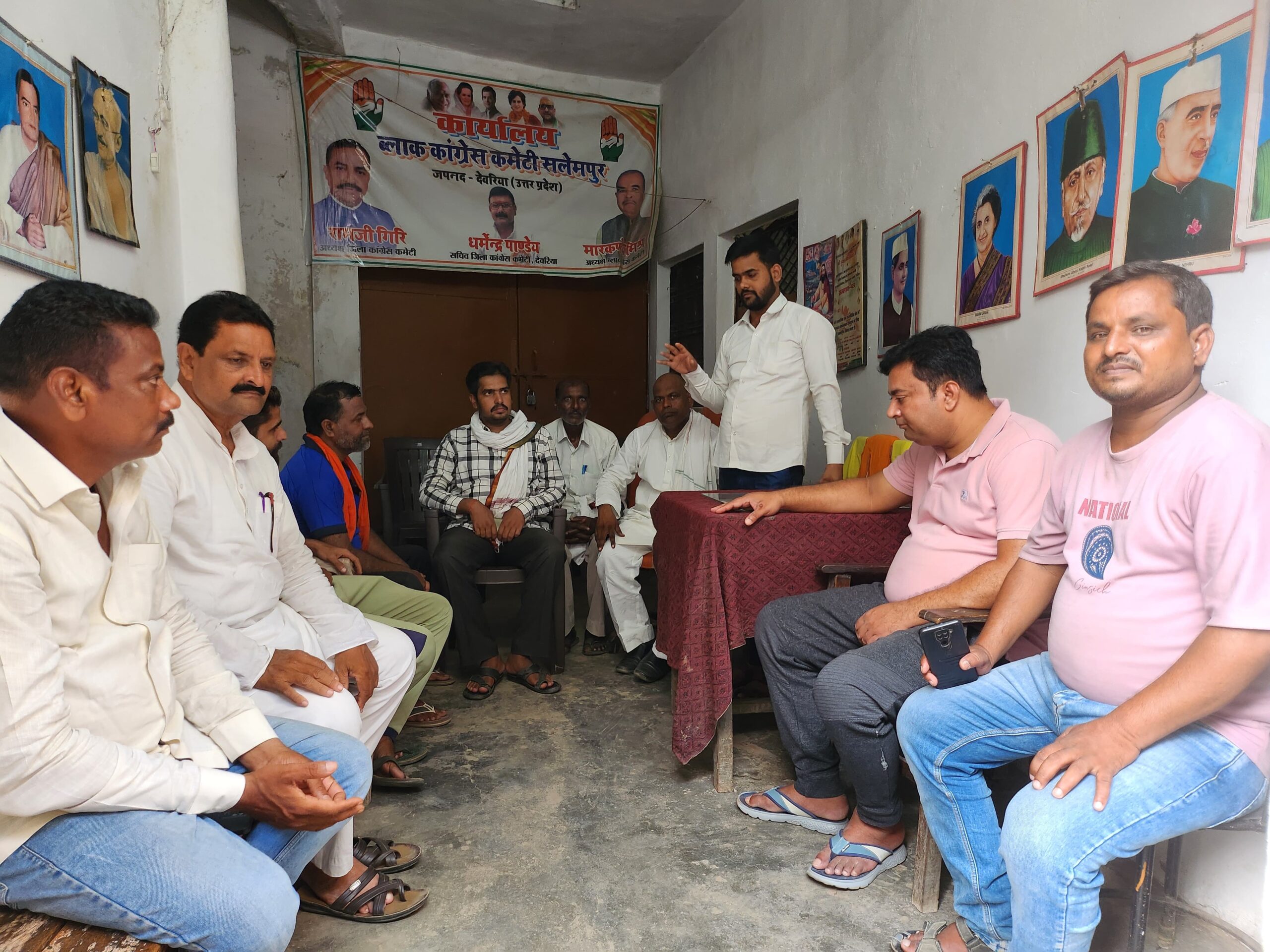 सलेमपुर,देवरिया(राष्ट्र की परम्परा)। युवा कांग्रेस कार्यकर्ताओं की संगठनात्मक बैठक जिला उपाध्यक्ष सत्यम पांडेय के नेतृत्व में ब्लॉक कार्यालय पर संपन्न हुई।बैठक में संगठन को और मजबूत करने व जनसमस्याओं को लेकर संघर्ष करने की रणनीति तैयार की गई। सम्बोधित करते हुए जिलाध्यक्ष गोविंद मिश्र ने कहा कि युवाओं के भविष्य की चिंता सिर्फ कांग्रेस को है। कांग्रेस ने युवाओं के रोजगार की व्यवस्था अपने शासन काल में की थी। भाजपा ने हर वर्ष दो करोड़ नौजवानों को नौकरी देने का वादा किया , लेकिन यह घोषणा हवा हवाई साबित हुआ।
