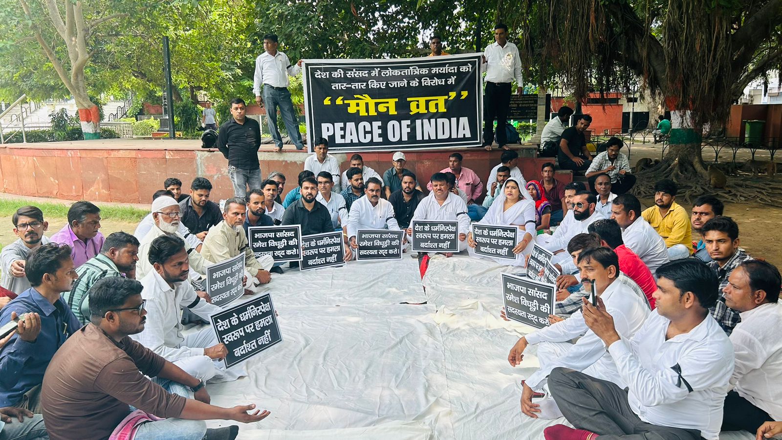 पीस ऑफ इंडिया के मौन धरना प्रदर्शन में मौजूद एआईएमआईएम के जिलाध्यक्ष शमशेर खान ने कहा कि सांसद भवन के अंदर जिस प्रकार संविधान की धज्जियां उड़ाई गई मैं उसकी कड़ी निंदा करता हूँ अगर ऐसा अमर्यादित बयान कोई विपक्षी पार्टी का नेता कर देता तो अब तक कार्यवाही हो गई होती, लेकिन सत्तापक्ष के सांसद रमेश बिधूड़ी के द्वारा जो अमर्यादित बयान दिया गया है उस पर अभी कोई कार्यवाही नहीं की गई है यह बड़े ही सोच का विषय है यह घटना बहुत ही शर्मनाक घटना है।