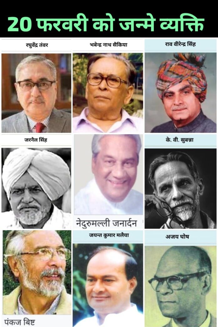 20 फ़रवरी को जन्मे व्यक्ति भारतीय साहित्य, राजनीति, खेल, सिनेमा और कला जगत में अपनी विशिष्ट पहचान रखते हैं। इतिहास के प्रमुख जन्मदिन के अवसर पर हम उन महान हस्तियों को याद करते हैं जिन्होंने अपने-अपने क्षेत्र में उल्लेखनीय योगदान दिया।