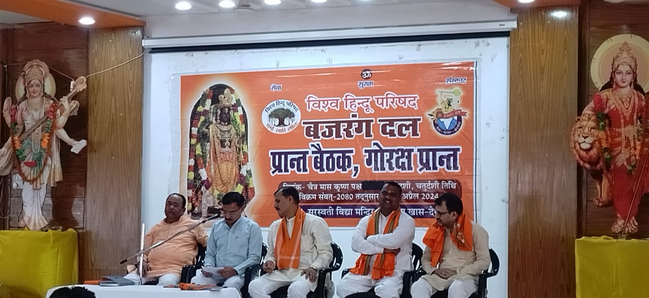 विश्व हिंदू परिषद, बजरंग दल गोरक्ष प्रांत की प्रात योजना बैठक 6, 7 अप्रैल 2024 को सरस्वती वरिष्ठ माध्यमिक विद्या मंदिर देवरिया खास जनपद देवरिया पर संपन्न हुआ। बैठक का शुभारंभ उपाध्यक्ष पुरुषोत्तम मरोदिया, प्रांत मंत्री नागेंद्र, लखनऊ क्षेत्र बजरंग दल संयोजक पुणेन्दु, प्रांत संयोजक दुर्गेश मंचासीन पदाधिकारीयों द्वारा भगवान राम के चित्र पर पुष्प अर्चन कर शुभारम्भ हुआ। समापन सत्र 7 अप्रैल 2024 दोपहर को मुख्य अतिथि प्रांत संगठन मंत्री राजेश उपस्थित रहे, उन्होंने कहा कि बजरंग दल संगठन के विस्तार को दोगुना करने के लिए सभी कार्यकर्ताओं को ग्राम स्तर तक संगठन को मजबूत बनाने के लिए पूरे मनोयोग से लग जाना चाहिए। जिले के सभी पदाधिकारी को प्रखंडों में प्रवास कर संगठन की गतिविधियों को संवाद के माध्यम से जन जन तक पहुंचा कर संगठन के विस्तार में अपनी महत्वपूर्ण भूमिका निभाना है । उन्होंने आगामी प्रतिवर्ष लगने वाले बजरंग दल एवं परिषद शिक्षा वर्ग प्रशिक्षण वर्ग के बारे में भी अवगत कराया। बैठक में कई कार्यकर्ताओ को नया पदभार दिया गया। इस कार्यक्रम में बजरंग दल, गौरव, प्रभात, रत्नेश रामसिंह, नमन , इत्यादि सैकड़ो कार्यकर्ता उपस्थित रहे |