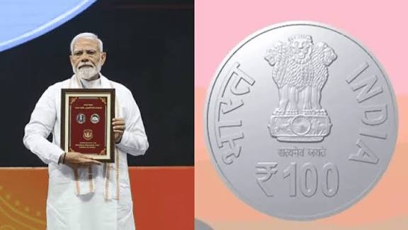 100 रुपये के स्मृति सिक्के पर एक ओर राष्ट्रीय चिन्ह और दूसरी ओर सिंह के साथ वरद-मुद्रा में भारत माता की छवि अंकित है।