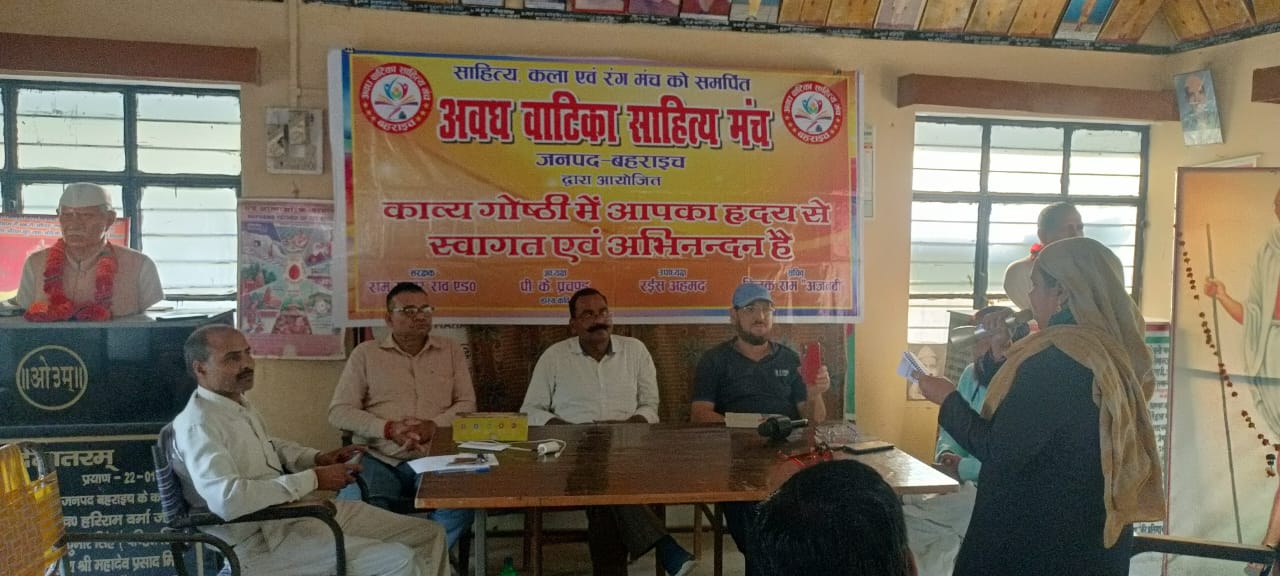 बहराइच (राष्ट्र की परम्परा)साहित्य, कला एवम रंग मंच को पूर्ण रूप से समर्पित अवध वाटिका साहित्य मंच जनपद बहराइच की पाक्षिक काव्य गोष्ठी हास्य कवि पी.के. प्रचण्ड की अध्यक्षता व रमेश कुमार मिश्र के मुख्य आतिथ्य में स्वतंत्रता संग्राम सेनानी सभागार कलेक्ट्रेट में युवा कवि अजित मौर्य के वाणी वंदना से प्रारम्भ हुआ। संचालन कवि तिलक राम अजनबी ने किया । कार्यक्रम को आगे बढ़ाते हुए शायरा फौजिया रसीद ने बेहतरीन गज़ल का मतला कुछ यूं पढ़ा बगबां फस्ल गुल बाग क्या गई, क्यूं हर एक सिम्त पर मुर्दगी छा गई । बहुत ही श्रोताओं ने सराहा, शायर कलीम खान “तनहा ” ने शानदार लहज़े में शेर पढ़ा आसमा हूं मैं जिसमे सितारा नही, वह नदी हूं जिसका किनारा नही । युवा कवि अजित मौर्य ने पंक्तियां कुछ यूं पढ़ा जश्ने महफिल सजा के देख लिया, बरसों आंसू बहा के देख लिया । तुमको अब तक भुला ना पाया मै है जतन आजमा के देख लिया ।। नानपारा से पधारे शायर शाहनवाज खान, बहराइची ने शेर पढ़ा तुम्हारा संगे दिल जो गया है। बहराइच के महबूब शायर रईस सिद्दीकी ने मां बाप की दुआओं की बात करते हुए गज़ल का मतला पढा पहले मा बाप की उल्फत को बसाया दिल में, तब कहीं जा के हमे आया इबादत करना | कार्यक्रम का संचालन कर रहे कवि तिलक राम अजनबी ने अपनी भावनाओं को पंक्तियों के माध्यम से