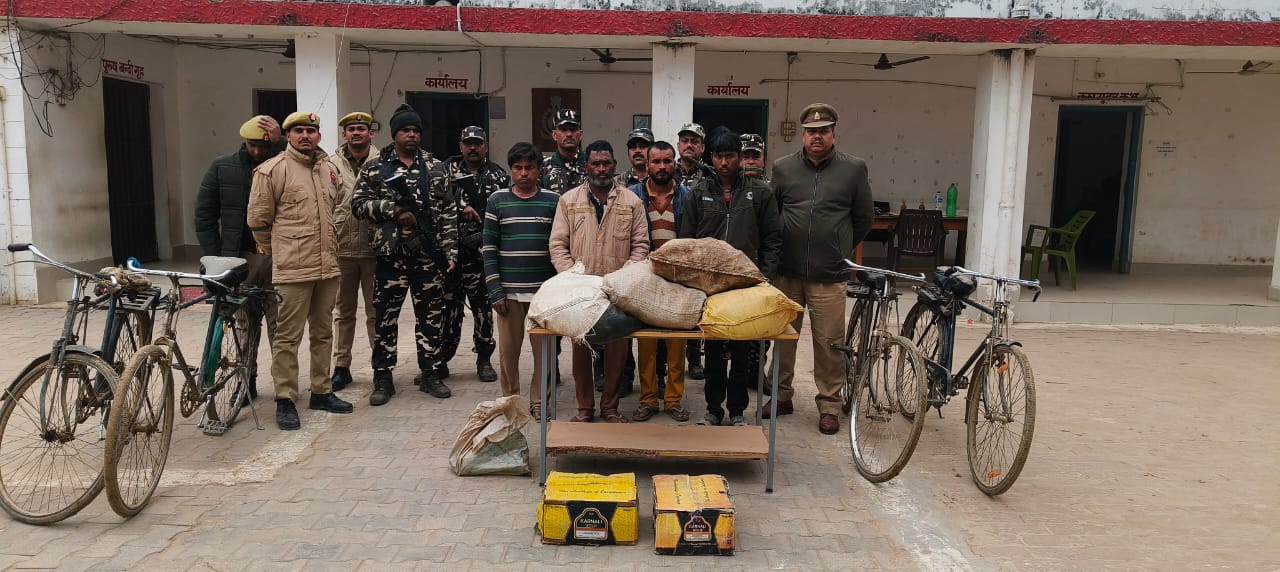 बहराइच (राष्ट्र की परम्परा) । सीमा सुरक्षा बल ने गस्त के दौरान भारत नेपाल सीमा की सुरक्षा में तैनात 59वीं वाहिनी सशस्त्र सीमा बल मुख्यालय नानपारा के द्वारा गुरुवार को अभिनव कश्यप कार्यवाहक कमान्डेंट 59वीं वाहिनी के नेतृत्व में निरीक्षक सामान्य सुरेन्द्र पाल एवं थाना मोतीपुर पुलिस के साथ संयुक्त गस्ती के दौरान मुखबिर सूचना के आधार पर सीमा स्तम्भ 657/01 से लगभग 100 मीटर भारत की तरफ गस्ती के दौरान चार व्यक्ति द्वारा नेपाल के तरफ से 120 बोतल अंतरराष्ट्रीय नेपाली शराब एवं 89 लीटर देशी कच्ची शराब लेकर आ रहे थे जिसको गस्ती दल द्वारा चैकिंग के दौरान पकड़ लिया गया, नाम पता पूछने पर अपना नाम सूरज चौहान उम्र 19 वर्ष निवासी जुगनिया थाना मोतीपुर बताया तीन अन्य साथ में थे पकडे गए अभियुक्त के खिलाफ मुकदमा दर्ज कर आगे की कार्यवाही की गई।