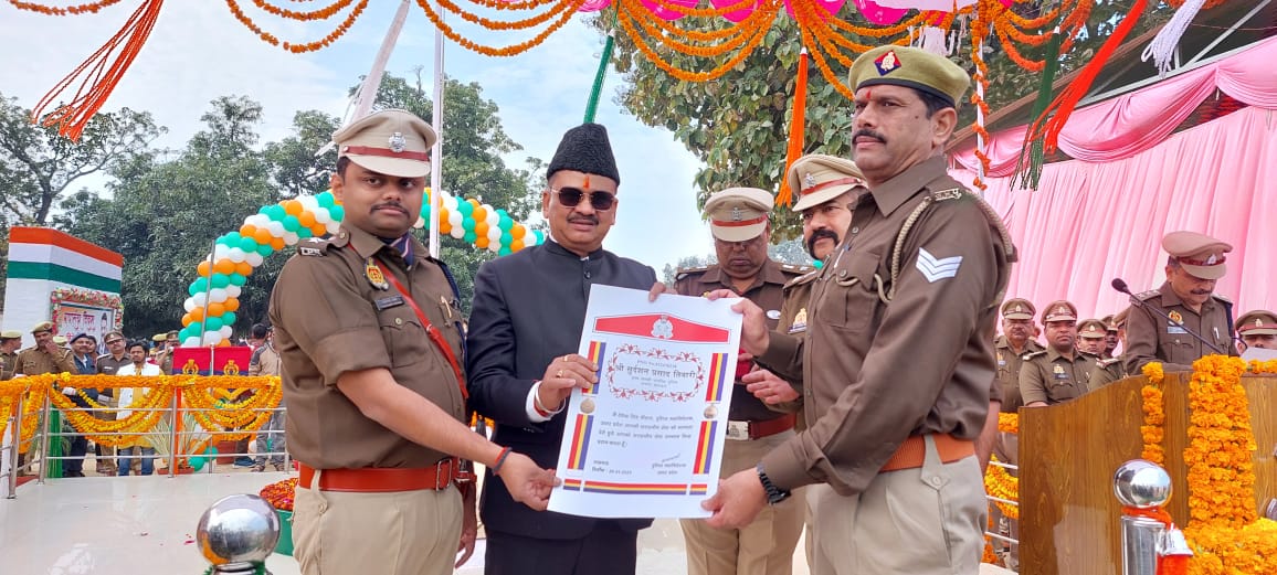 बहराइच (राष्ट्र की परम्परा)। गणतन्त्र दिवस के अवसर पर पुलिस लाइन परेड ग्राउण्ड में आयोजित समारोह में मुख्य अतिथि जिलाधिकारी डॉ. दिनेश चन्द्र व पुलिस अधीक्षक प्रशान्त वर्मा द्वारा संयुक्त रूप से जनपद के उत्कृष्ट कार्य करने वाले पुलिस अधिकारियों एवं कर्मचारियों को प्रशस्ति पत्र व मेडल प्रदान किया गया।