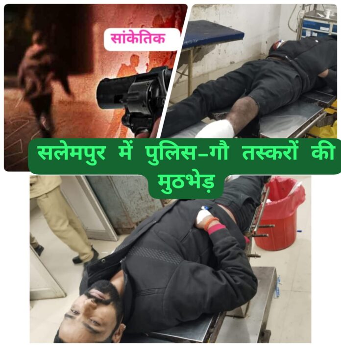 प्राप्त जानकारी के अनुसार थाना सलेमपुर पुलिस टीम सोहनाग–बरठा मुख्य मार्ग पर ग्राम धनौती राय के पास संदिग्ध व्यक्तियों और वाहनों की चेकिंग कर रही थी। इसी दौरान एक टाटा मैजिक वाहन (UP55T4297) को रोका गया, जिसमें तीन गोवंशीय पशु—एक गाय, एक बछिया और एक बछड़ा—अवैध रूप से लदे हुए पाए गए। पुलिस द्वारा रोकने पर वाहन सवार अभियुक्तों ने जान से मारने की नीयत से फायरिंग शुरू कर दी।