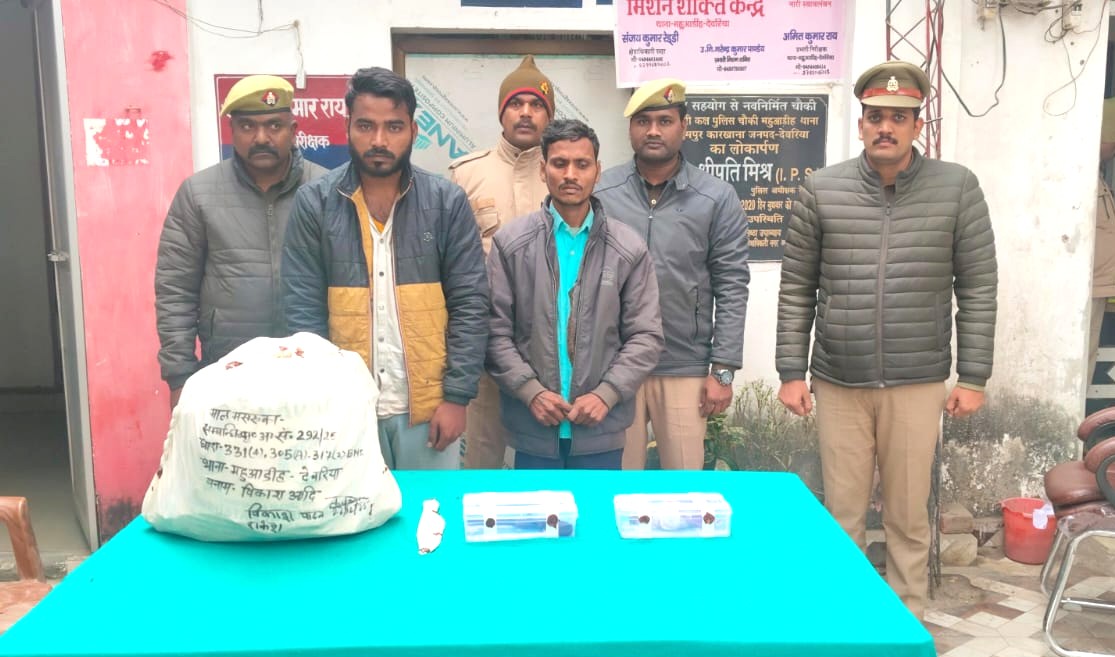 देवरिया(राष्ट्र की परम्परा)जनपद में अपराध एवं अपराधियों पर प्रभावी नियंत्रण के लिए चलाए जा रहे अभियान के तहत थाना महुआडीह पुलिस को बड़ी सफलता हाथ लगी है। पुलिस ने दो अलग-अलग चोरी की घटनाओं का सफल अनावरण करते हुए दो अभियुक्तों को गिरफ्तार किया है। अभियुक्तों के कब्जे से भारी मात्रा में चोरी का सामान, एक देशी तमंचा मय जिंदा कारतूस तथा एक चाकू बरामद किया गया है।पुलिस अधीक्षक देवरिया संजीव सुमन के निर्देशन में, अपर पुलिस अधीक्षक उत्तरी आनन्द कुमार पाण्डेय तथा क्षेत्राधिकारी नगर संजय कुमार रेड्डी के पर्यवेक्षण में थाना महुआडीह पुलिस द्वारा यह कार्रवाई की गई।थाना महुआडीह में पंजीकृत मु0अ0सं0-292/2025 (धारा 305ए, 331(4) बीएनएस) एवं मु0अ0सं0-295/2025 (धारा 305ए बीएनएस) से संबंधित मामलों में प्रकाश में आए अभियुक्तों राकेश यादव पुत्र जुड़ामन यादव एवं विकास यादव पुत्र गोपाल यादव, निवासी पकड़िहवा टोला, रामपुर दुबे, थाना महुआडीह, जनपद देवरिया को मुखबिर की सूचना पर दिनांक 22 दिसंबर 2025 को रामपुर दुबे धूस के पास से गिरफ्तार किया गया।क्या है पूरा मामला दिनांक 18 दिसंबर 2025 को कस्बा महुआडीह स्थित उपाध्याय जी के कटरा में संचालित एक कास्मेटिक दुकान का ताला तोड़कर अज्ञात चोरों द्वारा कास्मेटिक का सामान चोरी कर लिया गया था। इस संबंध में पीड़िता पिंकी देवंशी की तहरीर पर थाना महुआडीह में मुकदमा दर्ज कर विवेचना शुरू की गई।
