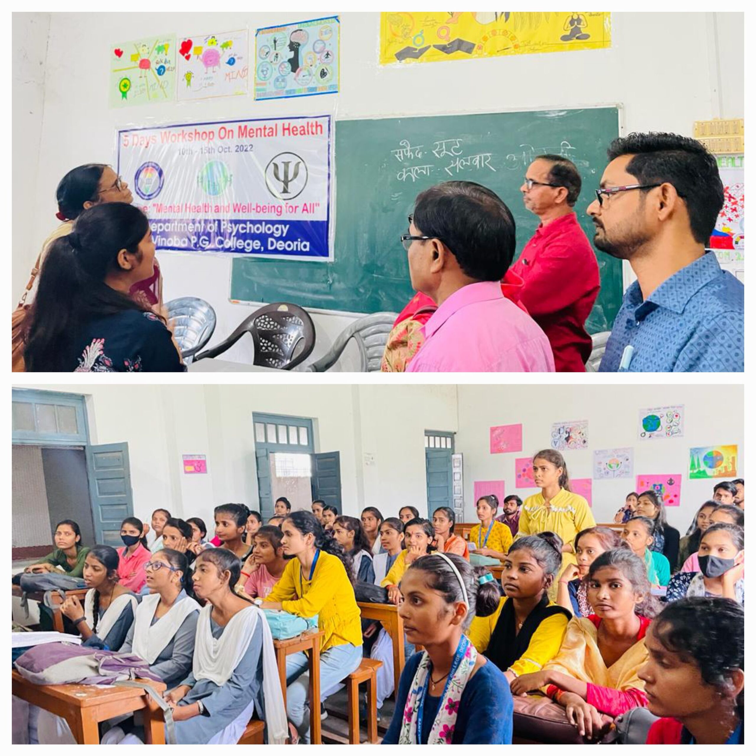 सन्त विनोबा पी.जी. कालेज देवरिया के मनोविज्ञान विभाग में पाँच दिवसीय कार्यशाला के दूसरे दिन आज महाविद्यालय के छात्र-छात्राओ द्वारा पोस्टर एवं स्लोगन बनाकर प्रस्तुत किया गया। यह आयोजन इस वर्ष की थीम ” मानसिक स्वास्थ्य एवं सभी के कल्याण को एक वैश्विक प्राथमिकता बनाना ” पर आधारित था जिसमें कुल तीस छात्र/ छात्राओं ने पोस्टर बनाकर प्रतिभाग किया। महाविद्यालय के प्राचार्य एवं शिक्षको द्वारा विद्यार्थियों की कृतियो का अवलोकन एवं मूल्यांकन किया गया।इस अवसर पर छात्र-छात्राओ की समस्याओं को डाॅ० नाजिश बानो (विभागाध्यक्ष मनोविज्ञान) तथा डा० शगुफ्ता फरोज द्वारा काउंसलिंग भी की गई ।महाविद्यालय के प्राचार्य प्रो. अर्जुन मिश्र ने विद्यार्थियों के कार्यो की सराहना और उत्साहवर्धन करते हुए कहा कि मानसिक स्वास्थ्य के लिए पैसा नहीं सन्तोष आवश्यक है।यह कलाकृतिया आपके प्रतिभा और संतोष दोनो को दिखा रही है।विद्यार्थीयों को सम्बोधित करते हुए डा0 नाज़िश बानो ने बताया कि समय का प्रबन्धन जीवन में अति आवश्यक है, इसलिए समय के मूल्य को समझे।अपने व्यवहार और जीवन शैली को समयानुकूल महत्व दें। उसके लिए ना कहना सीखे, यदि आपको लगता है, कि किसी बेकार कार्य मे समय बर्बाद होगा।आपकी नकारत्मकता बढ़ेगी, तो बेझिझक मना कर दें। अपने निरर्थक चिन्तन के लिए भी ‘ना’ का भाव रखें इससे आपका समय बचेगा पूरे समय को अपने परिवार समाज तथा बुजुर्ग लोगों के साथ सार्थक अन्तक्रिया को लगाएं। उससे आपमे आत्मविश्वास, मनोबल, आत्मसम्मान में वृद्धि देगी और आप मानसिक तथा शारीरिक दृष्टि से स्वस्थ महसूस करेगें। इस अवसर पर शारीरिक शिक्षा विभाग के अध्यापक मन्तोष मौर्य ने विद्यार्थियों को बताया कि कैसे हम स्वास्थ्य वर्धक भोजन एवं शारीरिक आराम के द्वारा अपने शरीर और मन को स्वस्थ रख सकते हैं।