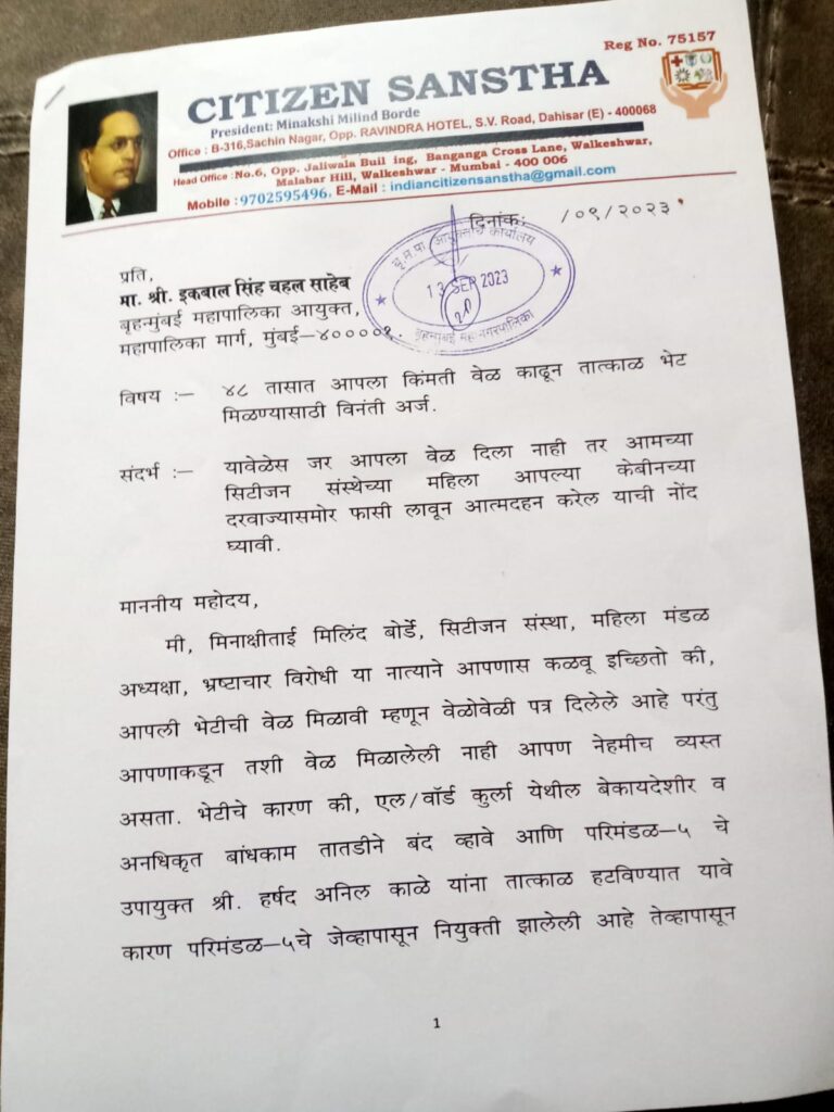 सिटीजन संस्था की महिला अध्यक्ष मिनाक्षीताई बोर्डे ने मनपा आयुक्त इकबाल सिंह चहल को पत्र लिखकर शिकायत की है कि, एल वार्ड मे अवैध निर्माण का सिलसिला जोरो पर शुरू है। जिससे मनपा के राजस्व को करोडो रुपये की हानी हो रही है और मनपा परिमंडल -5 के उपायुक्त के पास हमने कई बार लिखित मे शिकायत व पीजी मे बैठकर उक्त अवैध नवनिर्माणो की चर्चा की, मगर हर्षद काले इस गम्भीर विषय पर अभी तक कोई ठोस कारवाई किये नही है।