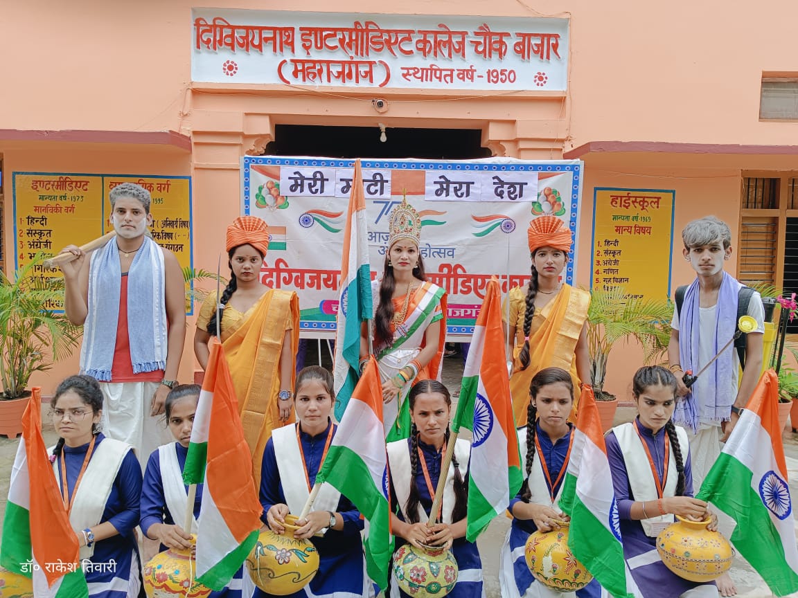 दिग्विजयनाथ इंटरमीडिएट कॉलेज चौक बाजार महराजगंज में महानिदेशक स्कूल शिक्षा उत्तर प्रदेश एवं जिला विद्यालय निरीक्षक महराजगंज अमरनाथ राय के निर्देश के क्रम में अमृत महोत्सव के अंतर्गत मेरी माटी मेरा देश विषय पर कार्यक्रम आयोजित किया गया। कार्यक्रम में छात्र-छात्राओं द्वारा खेत खलिहान एवं अनेक देवस्थान से मुट्ठी मुट्ठी भर मिट्टी लेकर कलश में रखा गया। साथ ही साथ इस कलश के साथ तिरंगा भी लगा रहा जो हमारे देश की आन बान शान शौर्य पराक्रम और अभियान का प्रतीक है। इस अवसर पर एक सुंदर झांकी प्रस्तुत की गई जिसमें भारत माता ,रानी लक्ष्मीबाई ,हमारे देश के किसान ,देश के जवान और तिरंगा लिए हुए छात्र-छात्राओं की झांकी आकर्षण का केंद्र रही।