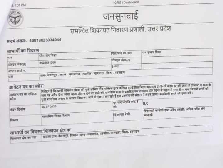 समय समय पर बच्चों से तमाम कारण बता कर अवैध रूप से पैसा मंगाया जाता है जिसकी पूर्ति न होने पर बच्चों को मानसिक रूप से प्रताड़ित किया जाता है उनका कहना है आज जिस तरह से उनकी बेटी को प्रताड़ित किया गया है उस से वह अब घर आकर काफी डिप्रेशन में है ।