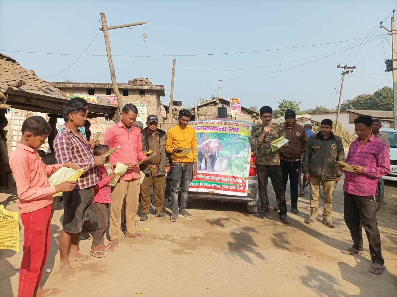 बहराइच(राष्ट्र की परम्परा)l जनपद के मोतीपुर , कतर्नियाघाट वन्य जीव प्रभाग की और से आम्बा, विशनापुर, रमपुरवा, फकीरपुरी, बर्दिया गाँवों में चला फ्रेंड्स क्लब का जागरूकता रथ पम्प्लेट और बिस्कुट वितरित कर ग्रामीणों को किया गया जागरूक l कतर्नियाघाट फ्रेंड्स क्लब के संयुक्त तत्वाधान में संरक्षित वन क्षेत्र की कतर्नियाघाट और निशानगाढ़ा रेंज के आम्बा, विशुनापुर, रमपुरवा, फकीर पुरी व बर्दिया गाँवों में मानव हाथी संघर्ष की रोकथाम हेतु ग्रामीणों को जागरूक करने के उद्देश्य से जागरूकता रथ चलाया गया l